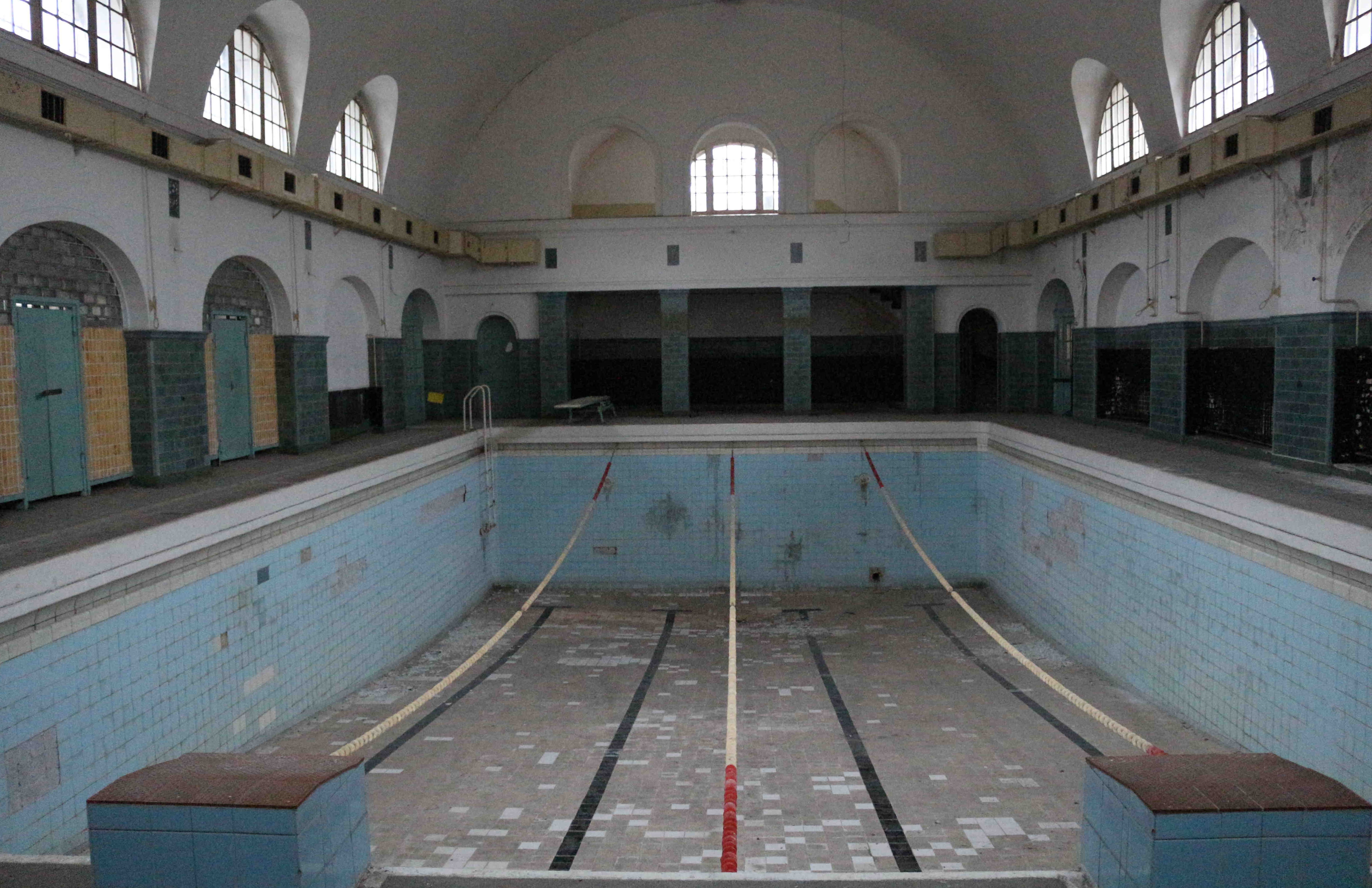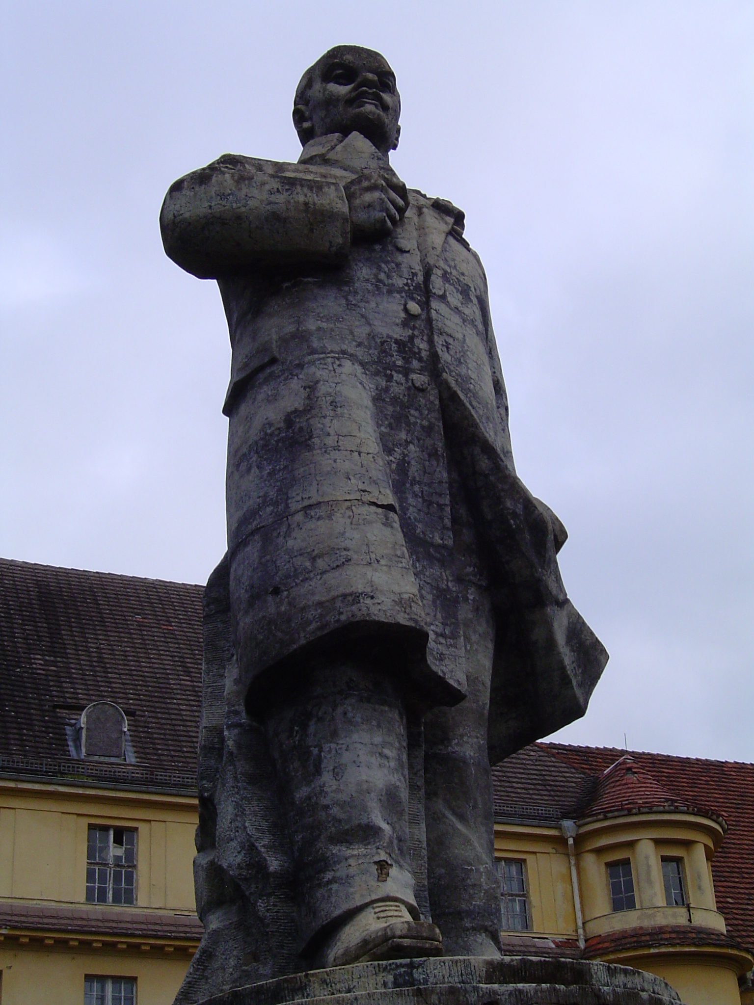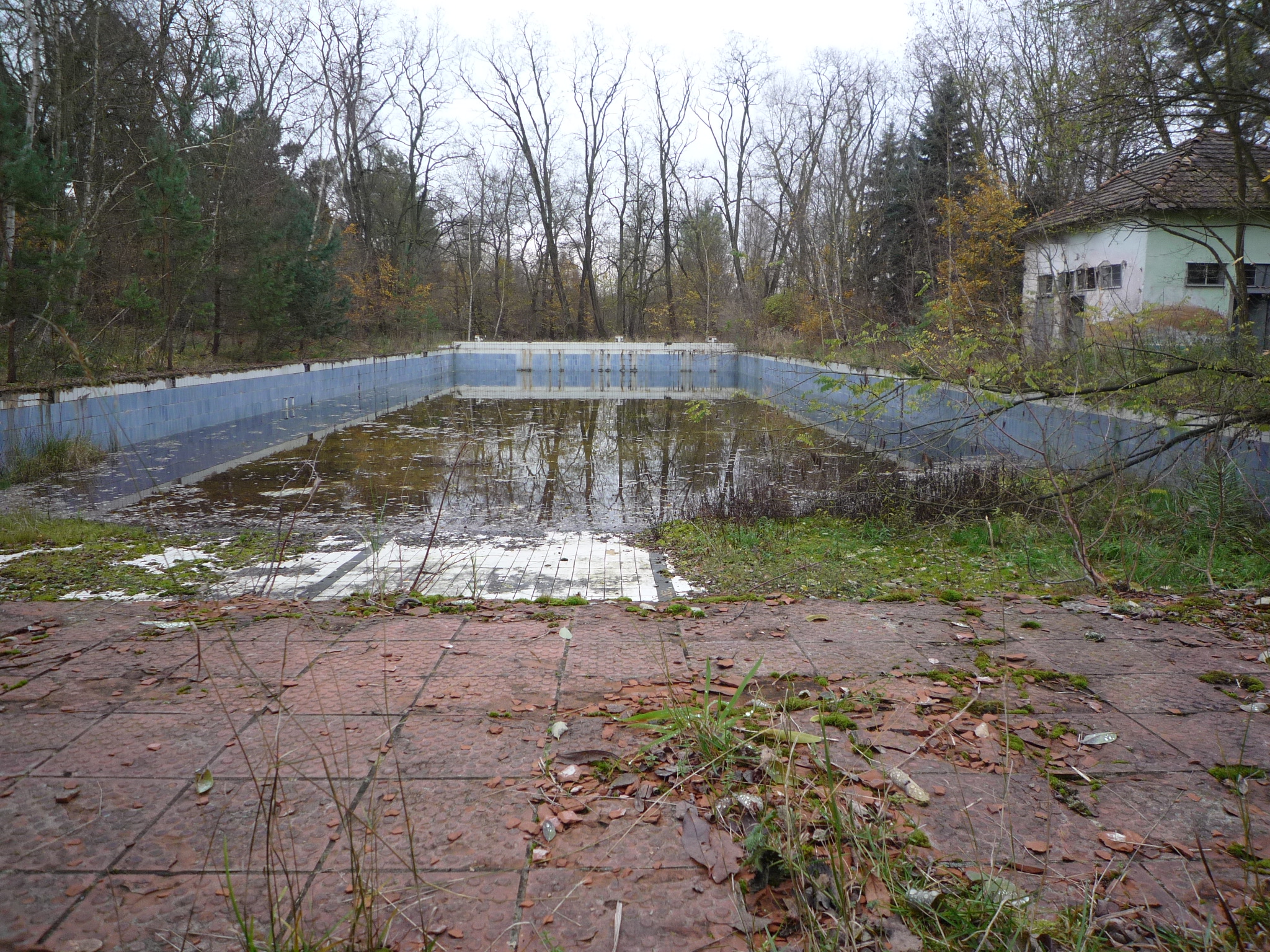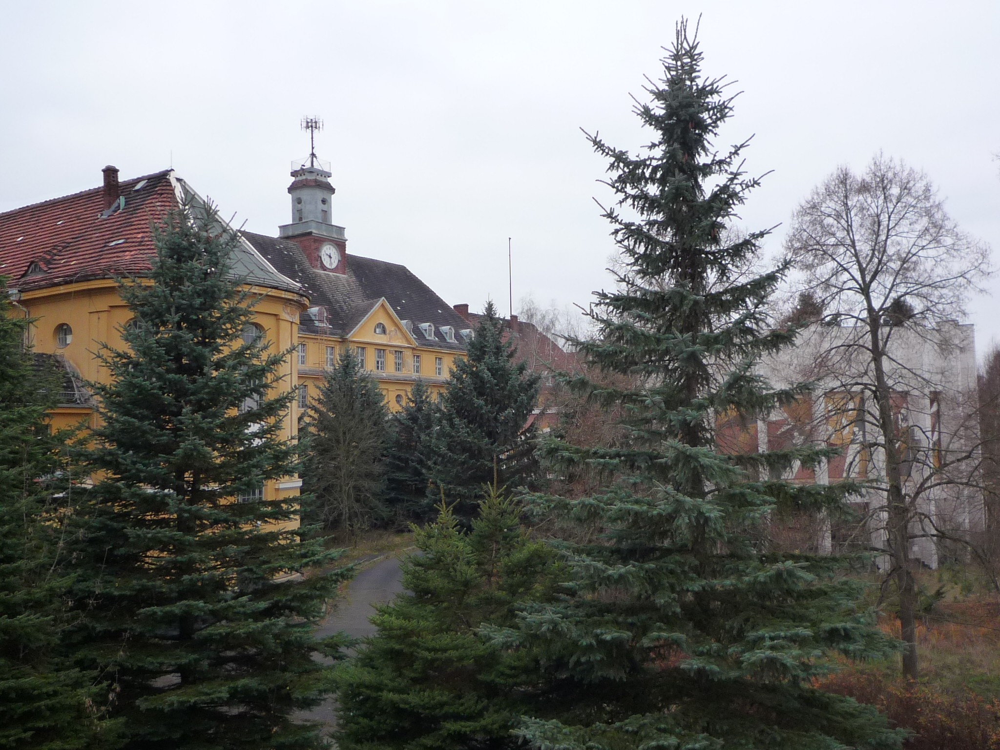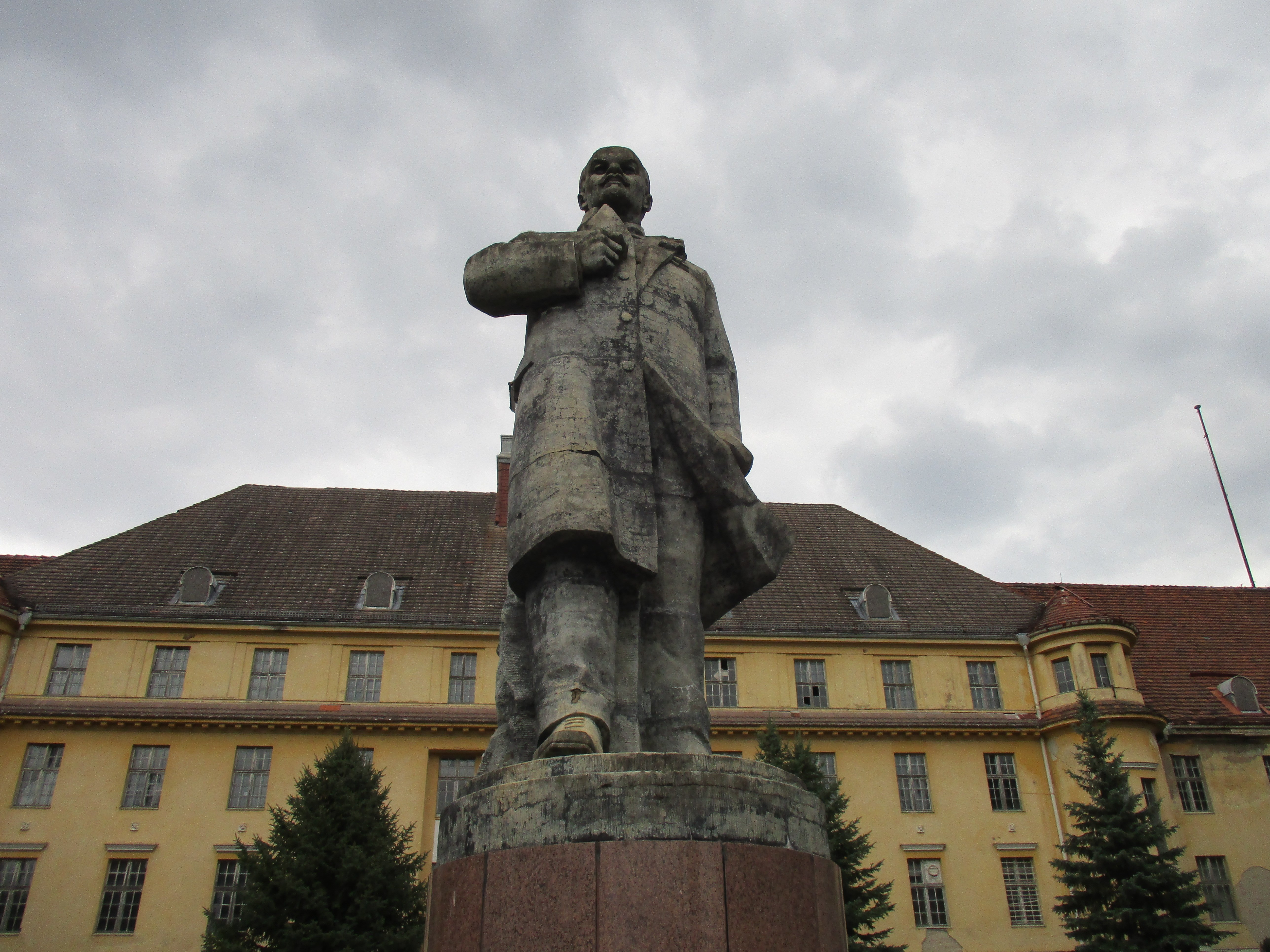 The Haus der Offiziere used to be a military sport center (1919-1933) and the sport school of the German army (1933-1945) until the Soviet occupation troops established here the cultural epicenter of their biggest garrison in Germany: Wünsdorf. It had a concert house, a cinema, a solemn lunchroom, a library and even a museum. They also conserved some of the sport facilities, as the swimming pools (outdoor and indoor) and a sauna. The big statue of Lenin was set just in front of the main building: it is over four meters high and stands on a pedestal of red granite. This singular stone had been stored in large amounts by Adolf Hitler, who pretended to use it after the end of the war, in order to ornament impressively some of Berlins most important monuments. Finally it were the Soviets, who used it to garnish their own memorials. This particular one was made by Vladimir Gontsharov and inaugurated on the 20. April 1970.