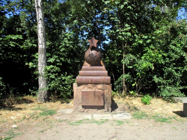 There is also a bronze panel fixed to the big stone block, which serves as a pedestal. It explains that the sculpture was made by the workers of an old pump plant for the 100th anniversary of Lenin.This information is crucial for the fact, that it is still standing in the park: Since it was an homage from a group of workers to Lenin, but the monument was never given to the city, the issue, referring to its legal property is unclear, so that neither the town hall, nor any other local or national administration, is allowed to remove it. Therefor it also seems that nobody cares about the maintenance of the old monument, so that it is stained with red ink since a few months. But actually the color red matches quite well with the Soviet star with Lenin’s head. One could think that more than an action of vandalism, it was rather meant to be a tribute to the communist revolution…