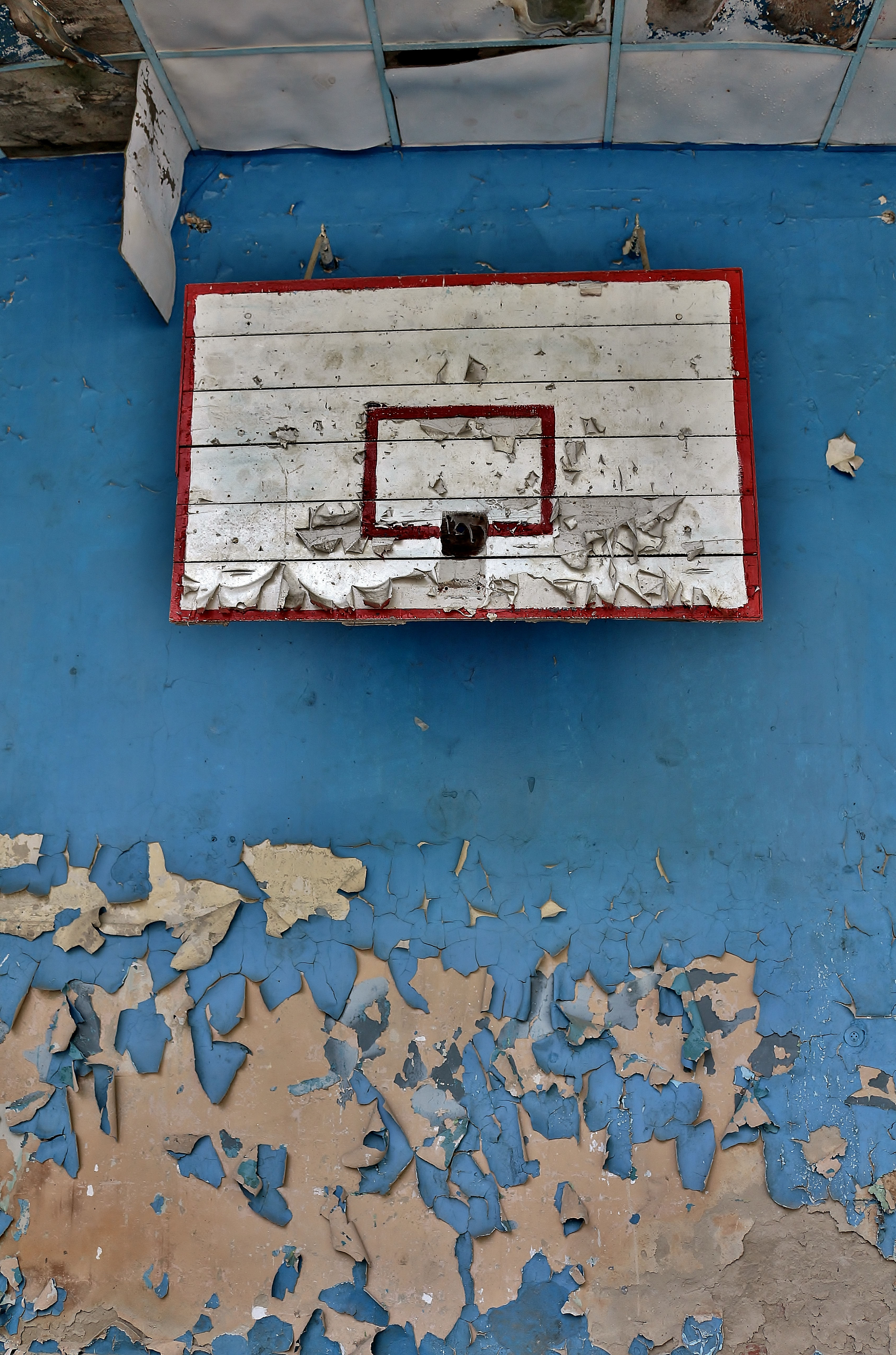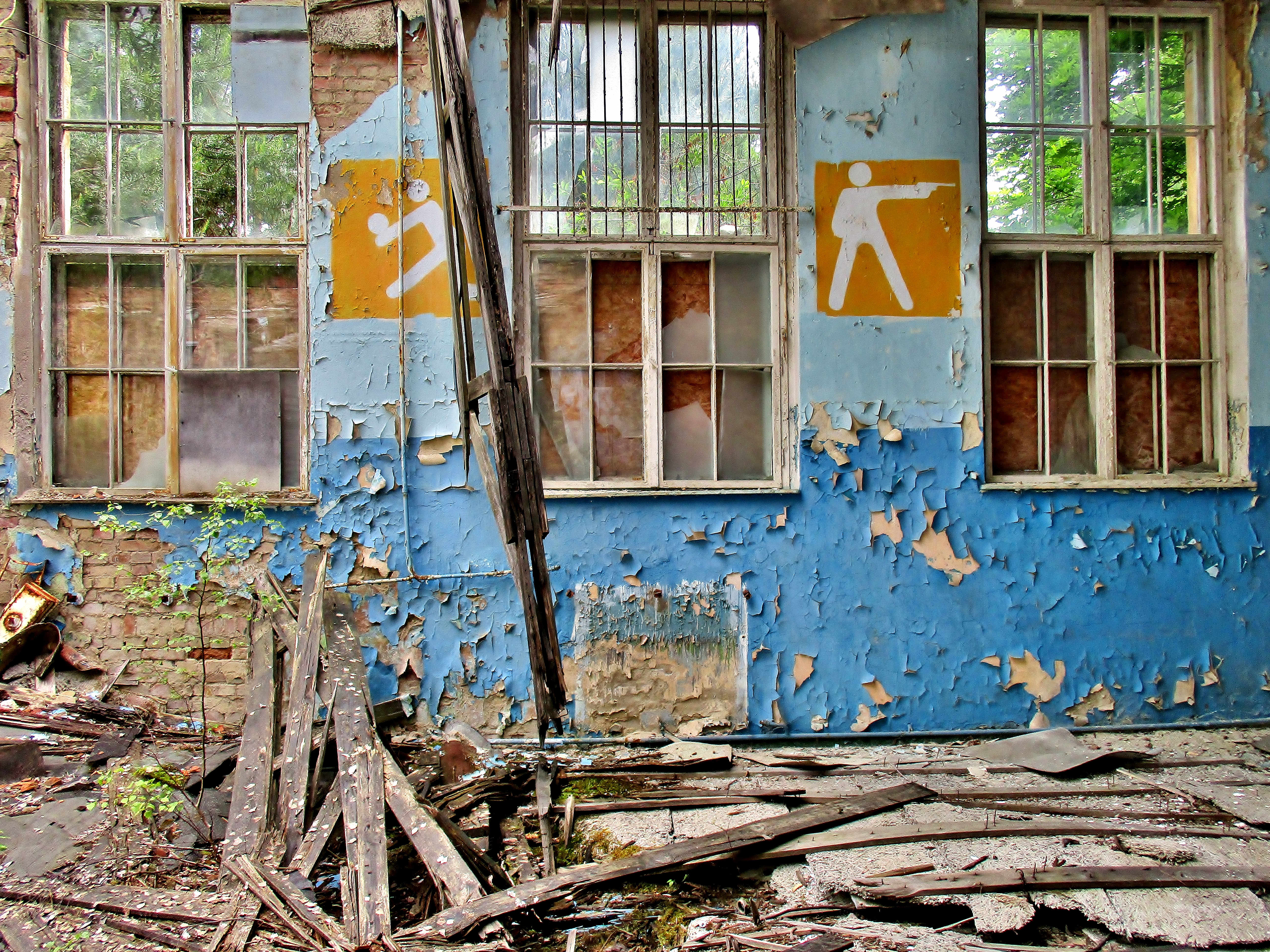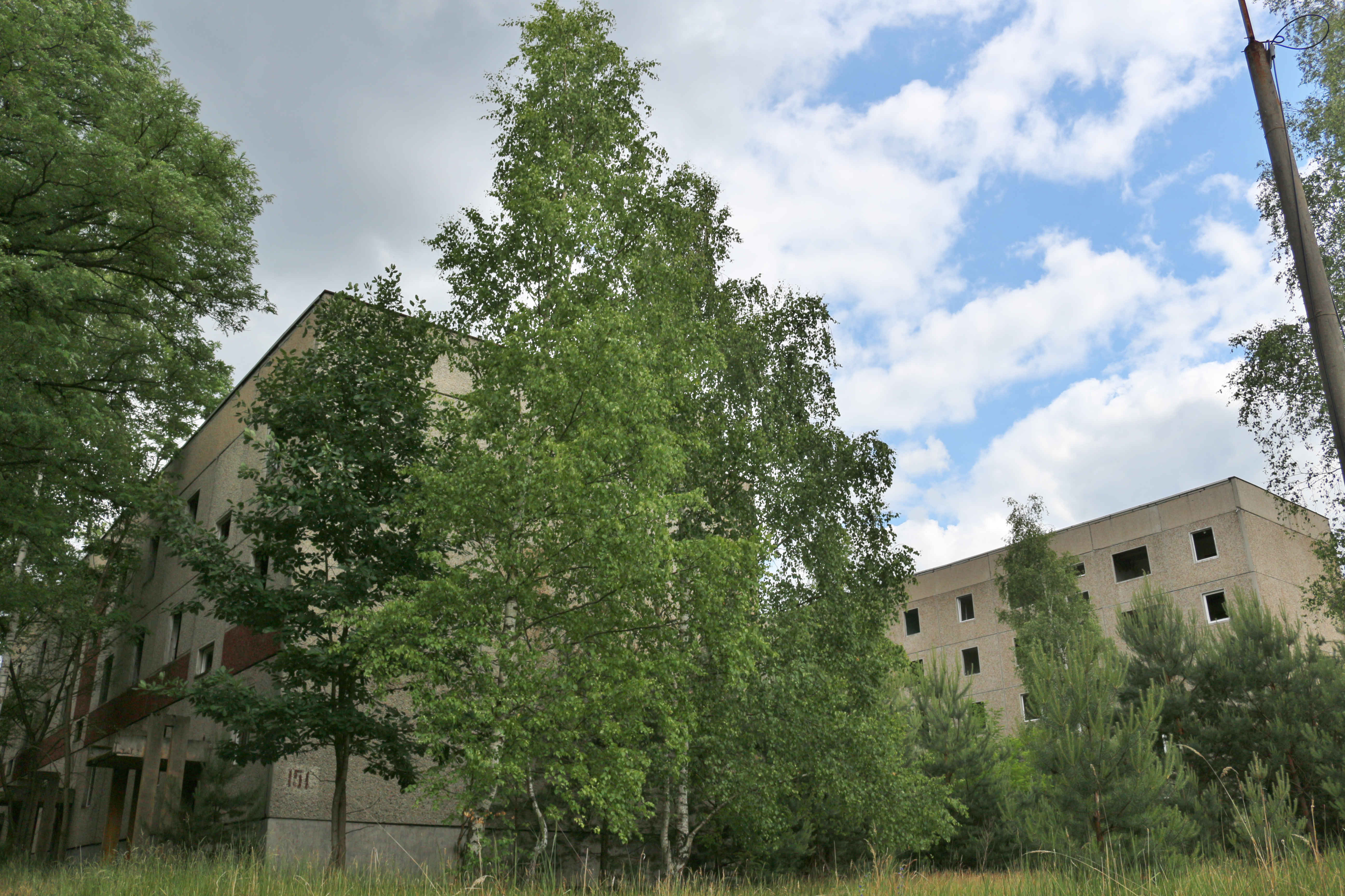 oder einem Fiktionsfilm in Verbindung setzen. Die Gebäude sind zum Teil sehr gut erhalten und man könnte sich fast wie in einem x-beliebigen Wohnviertel irgendeiner deutschen Kleinstadt fühlen – wenn da nicht die kaputten Fenster und der Umhang blühender Pflanzenwelt wären. Sogar innerhalb der leer stehenden Wohnungen beginnen Sträucher und Bäume zu wachsen. Unweit der Unterkünfte bietet die Sporthalle der ehemaligen Schule die nächste bizarre Erscheinung: Die Decke ist komplett herabgestürzt, aber an den Außenwänden, auf beiden Seiten eines Trümmerhaufens aus morschen Holzbalken und verbogenen Deckenplatten, hängen noch stoisch die weiß-roten Backboards der ehemaligen Basketballkörbe.