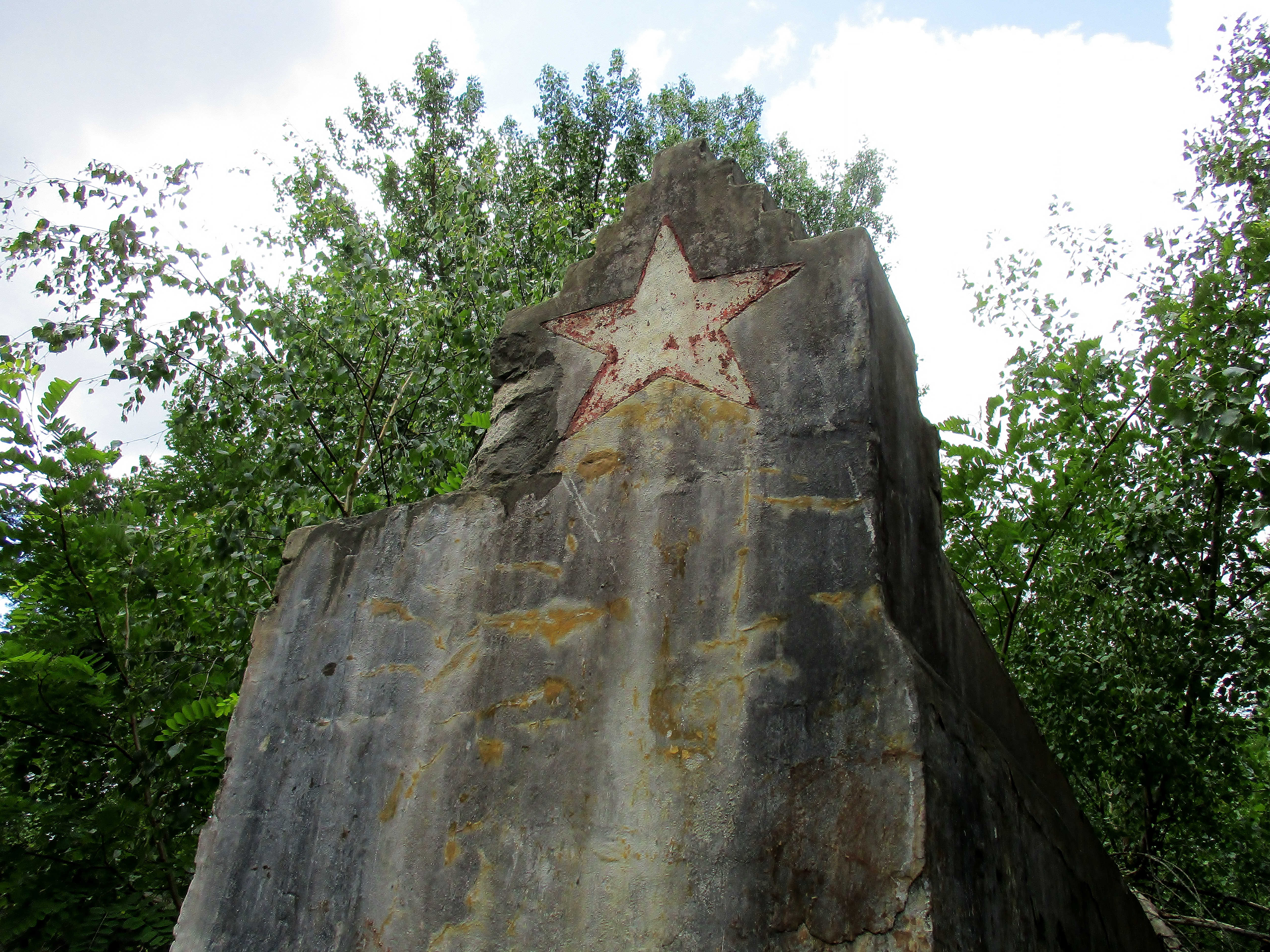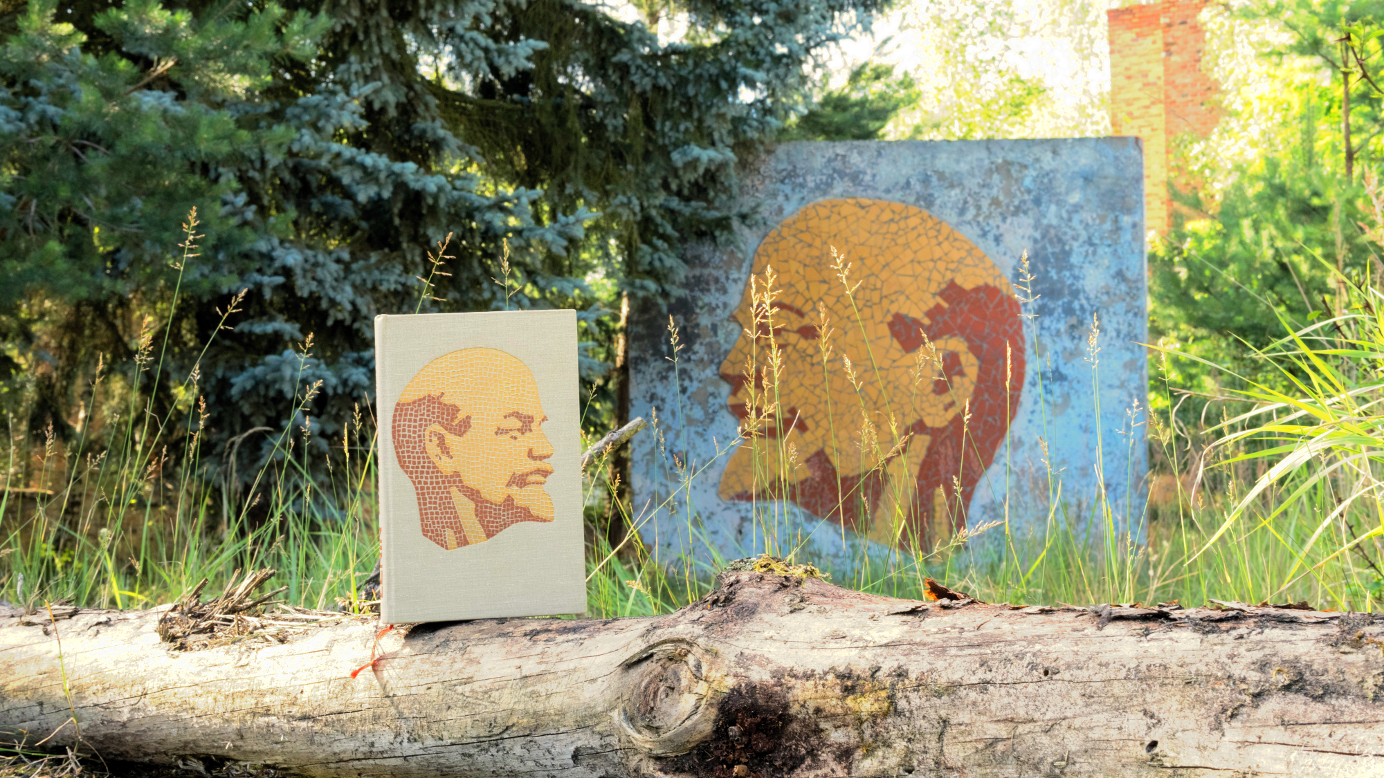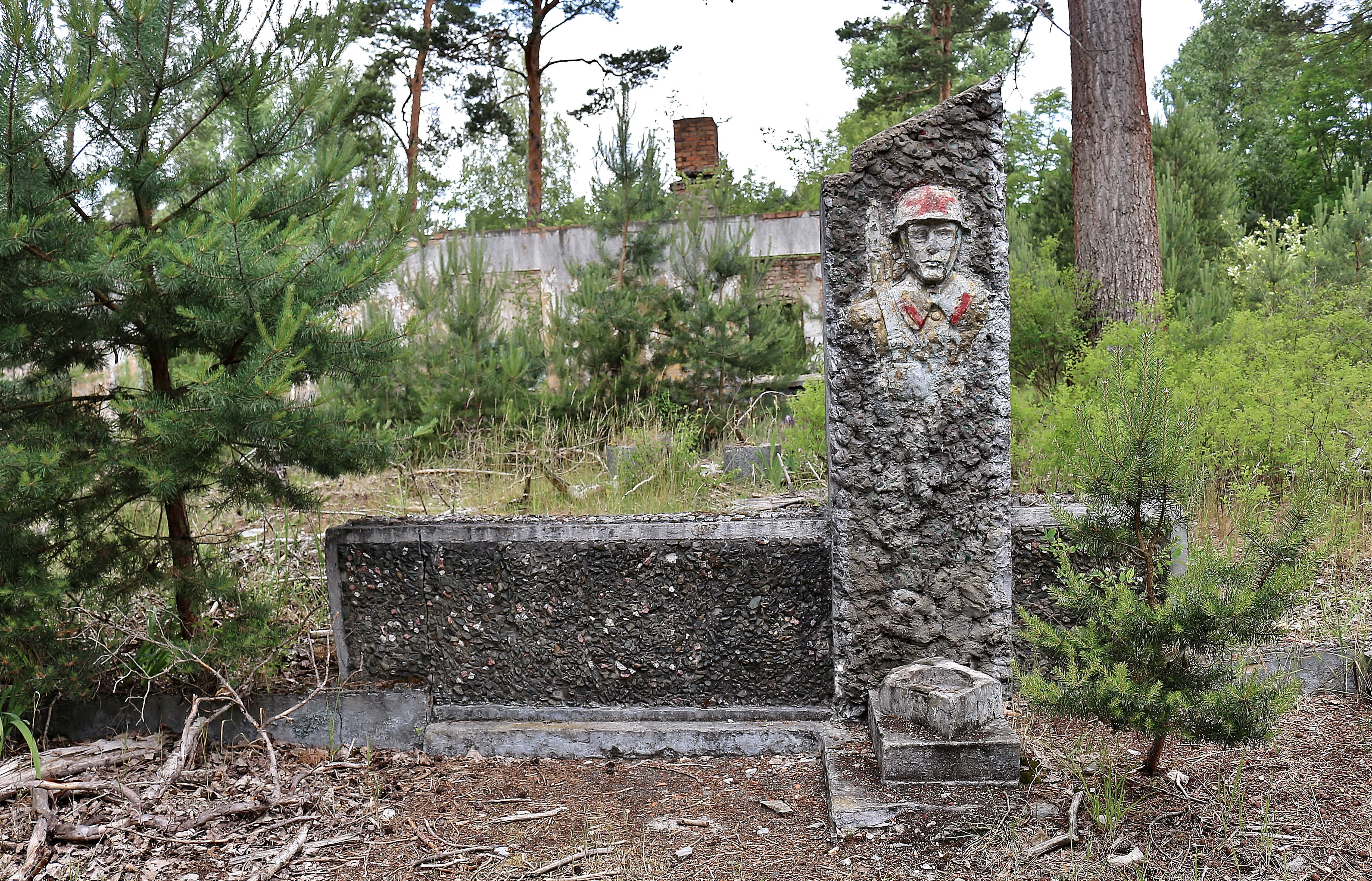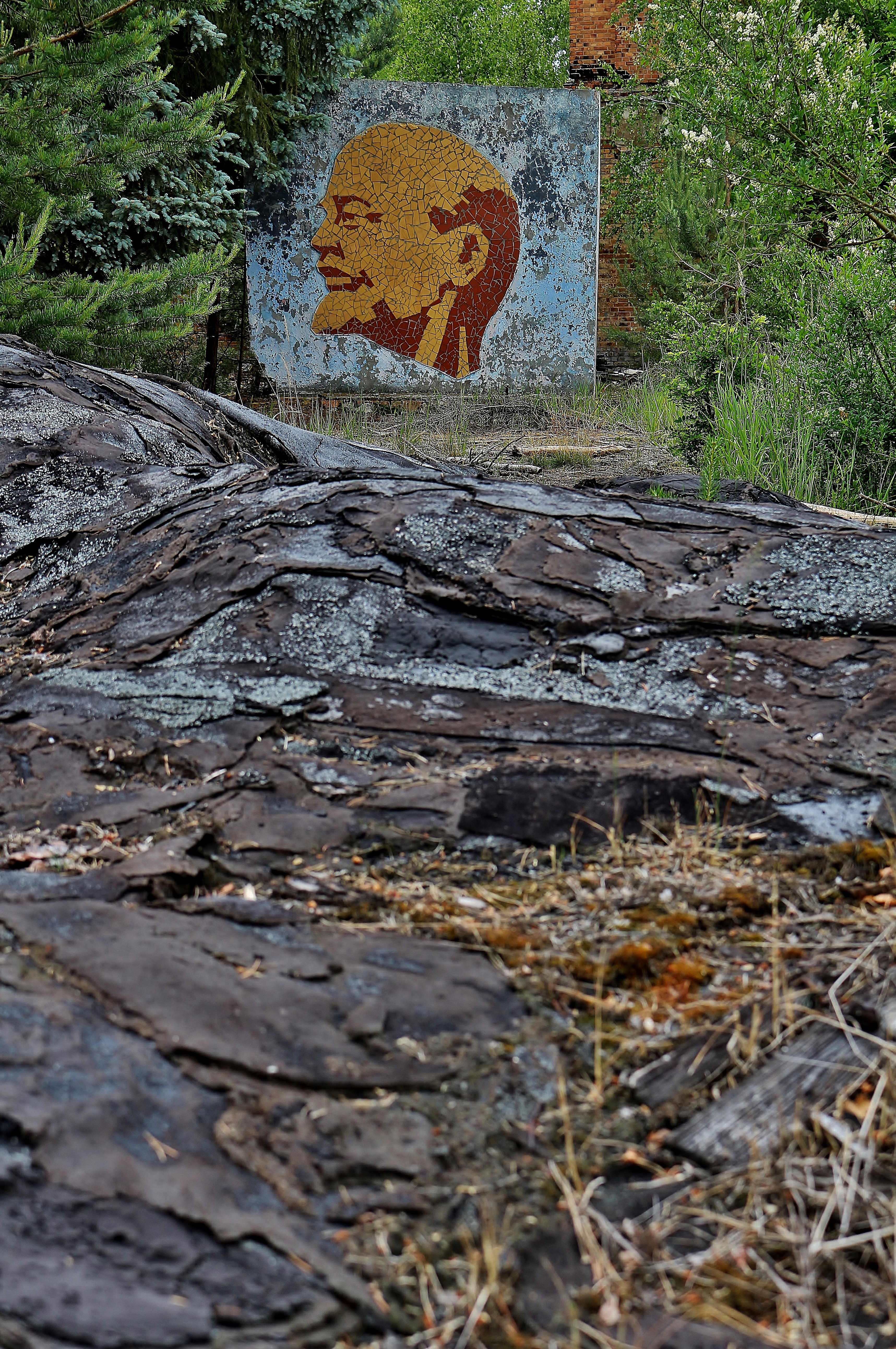 Weiter westlich findet man ein großes Gebiet, in dem sehr wenig von den alten einstöckigen Bauten übrig geblieben ist – höchstens die Außenwände. Aber just zwischen diesen Skelettkonstruktionen sind noch zwei symbolträchtige Überbleibsel der sowjetischen Präsenz erhalten. Der steinerne Kopf eines Soldaten steht hier noch unauffällig an einer Stelle, wo es früher einen Fahnenmast gab. Nur der von einem Nostalgiker auf den Helm gemalte rote Stern hebt die graue Skulptur von der mattfarbigen Umgebung ein bisschen ab. Das Lenindenkmal ist dagegen einfach nicht zu übersehen. Schon aus der Distanz kann man die Darstellung des kommunistischen Helden als Mosaikpuzzle sehen. Aus Respekt oder vielleicht auch einfach aus Bange weichen hier sogar die Büsche und Bäume aus: Vor dem Denkmal gibt es nichts, was – vom alten Weg des Militärgeländes aus gesehen – die Sicht auf den kommunistischen Helden versperren könnte. Und damit haben wir das letzte außergewöhnliche Bild des Tages: inmitten zerbröckelnder Ruinen und umrahmt von wildwüchsiger Natur steht ein gut erhaltener, leicht lächelnder Lenin in extravaganten gelben Farbtönen…