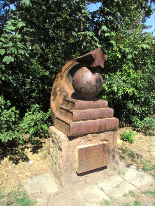 There is also a bronze panel fixed to the big stone block, which serves as a pedestal. It explains that the sculpture was made by the workers of an old pump plant for the 100th anniversary of Lenin.This information is crucial for the fact, that it is still standing in the park: Since it was an homage from a group of workers to Lenin, but the monument was never given to the city, the issue, referring to its legal property is unclear, so that neither the town hall, nor any other local or national administration, is allowed to remove it. Therefor it also seems that nobody cares about the maintenance of the old monument, so that it is stained with red ink since a few months. But actually the color red matches quite well with the Soviet star with Lenin’s head. One could think that more than an action of vandalism,