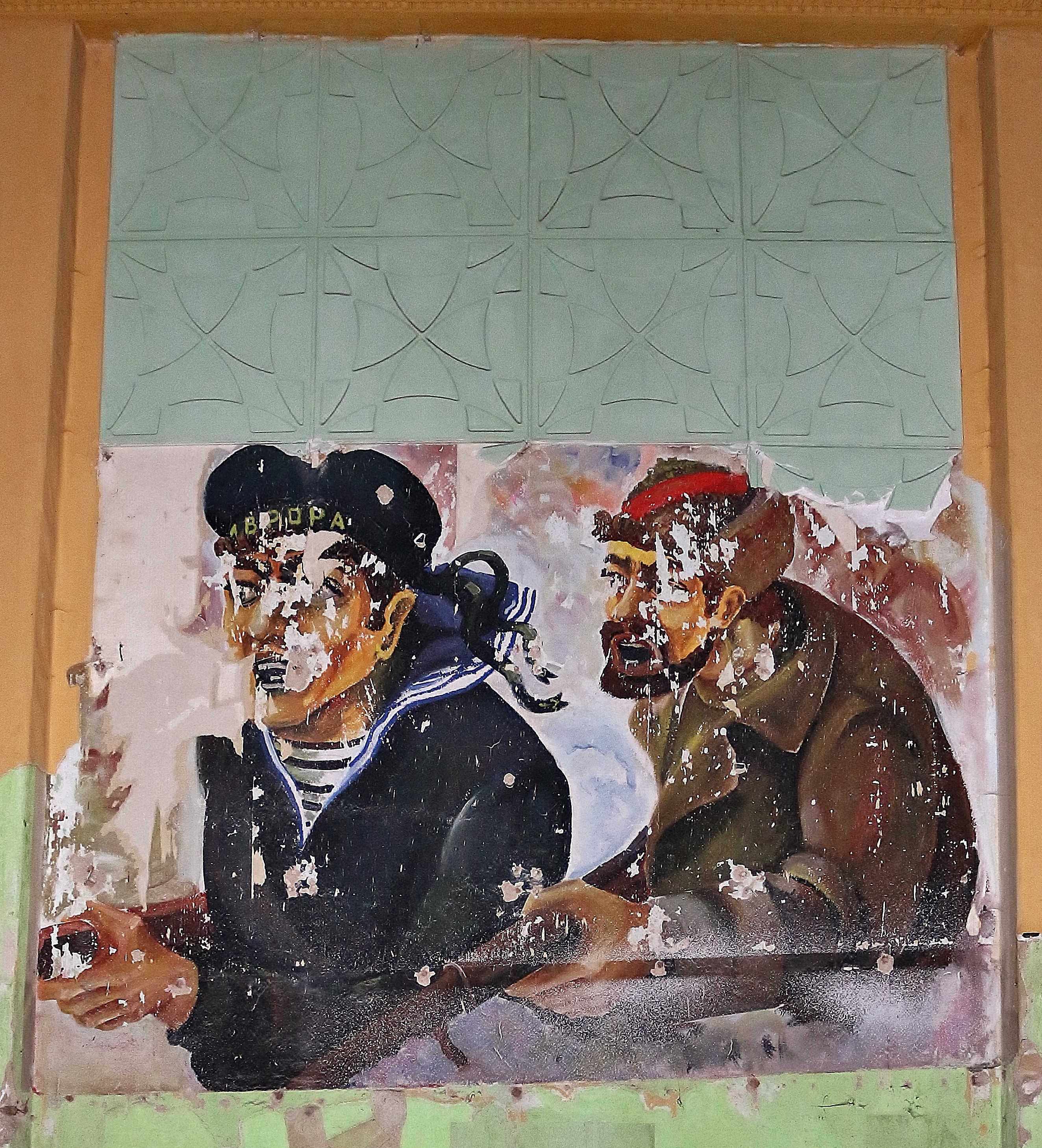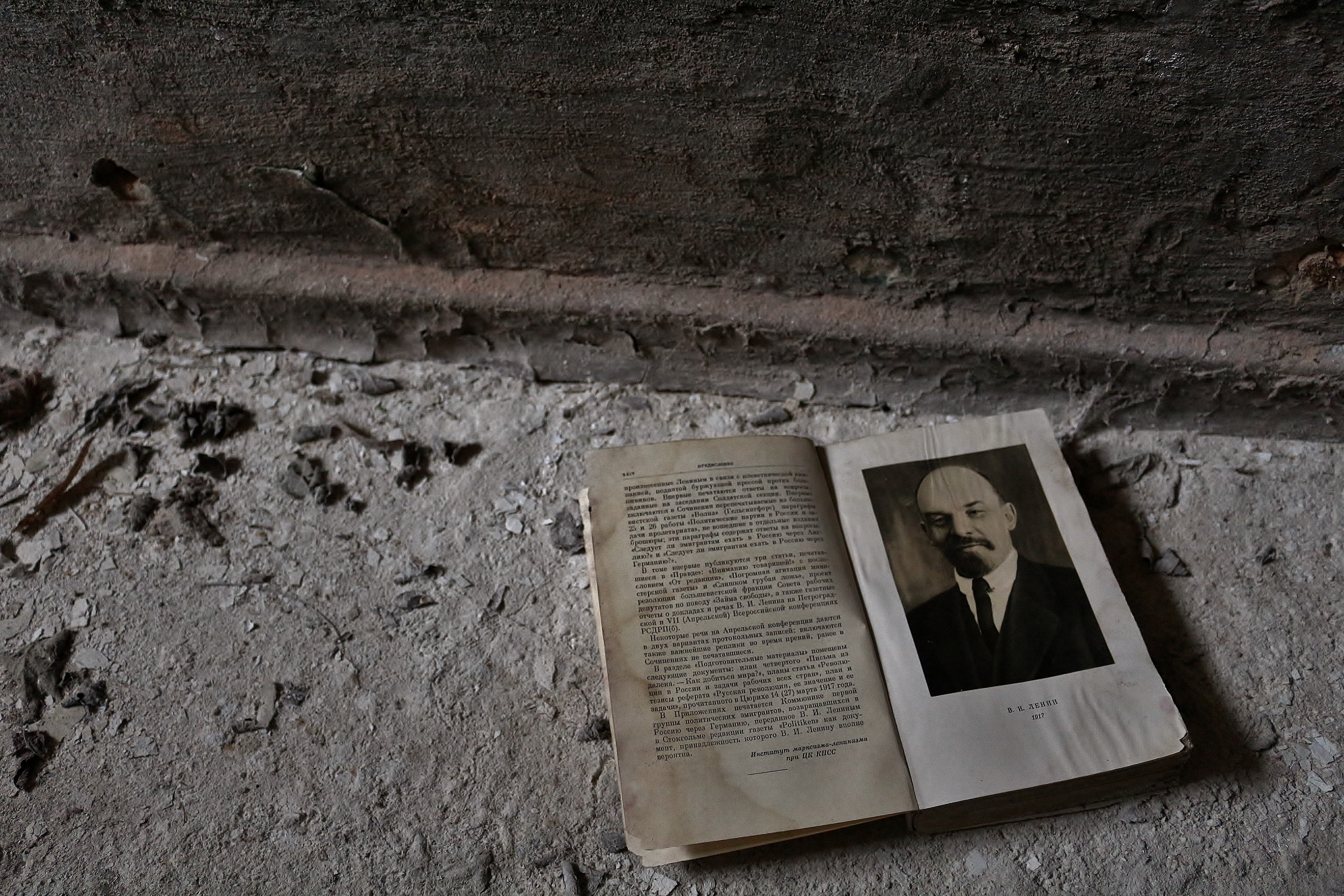 letzten sowjetischen Soldaten rumliegen (Kleidung, Musiknoten, ein Fußball, leere Wodkaflaschen oder Anweisungen zur Bedienung eines Maschinengewehrs), auch einige Abbildungen Lenins finden: alte politische Plakate, Bücher von bzw. über den sowjetischen Revolutionär, Zeitungsartikel und –fotos mit Referenzen zu Lenin oder eine große Wandtafel mit seinem Kopf im dunklen Heizkeller der Sauna. Gemäß der Inschrift diente die Tafel der Organisation der Arbeitsverteilung der Heizer. Direkt vor Lenin steht hier ein altes Schachbrett, wahrscheinlich um ihn vor der Langweile zu retten, schließlich war er in seinen jungen Jahren ein begeisterter Schachspieler.