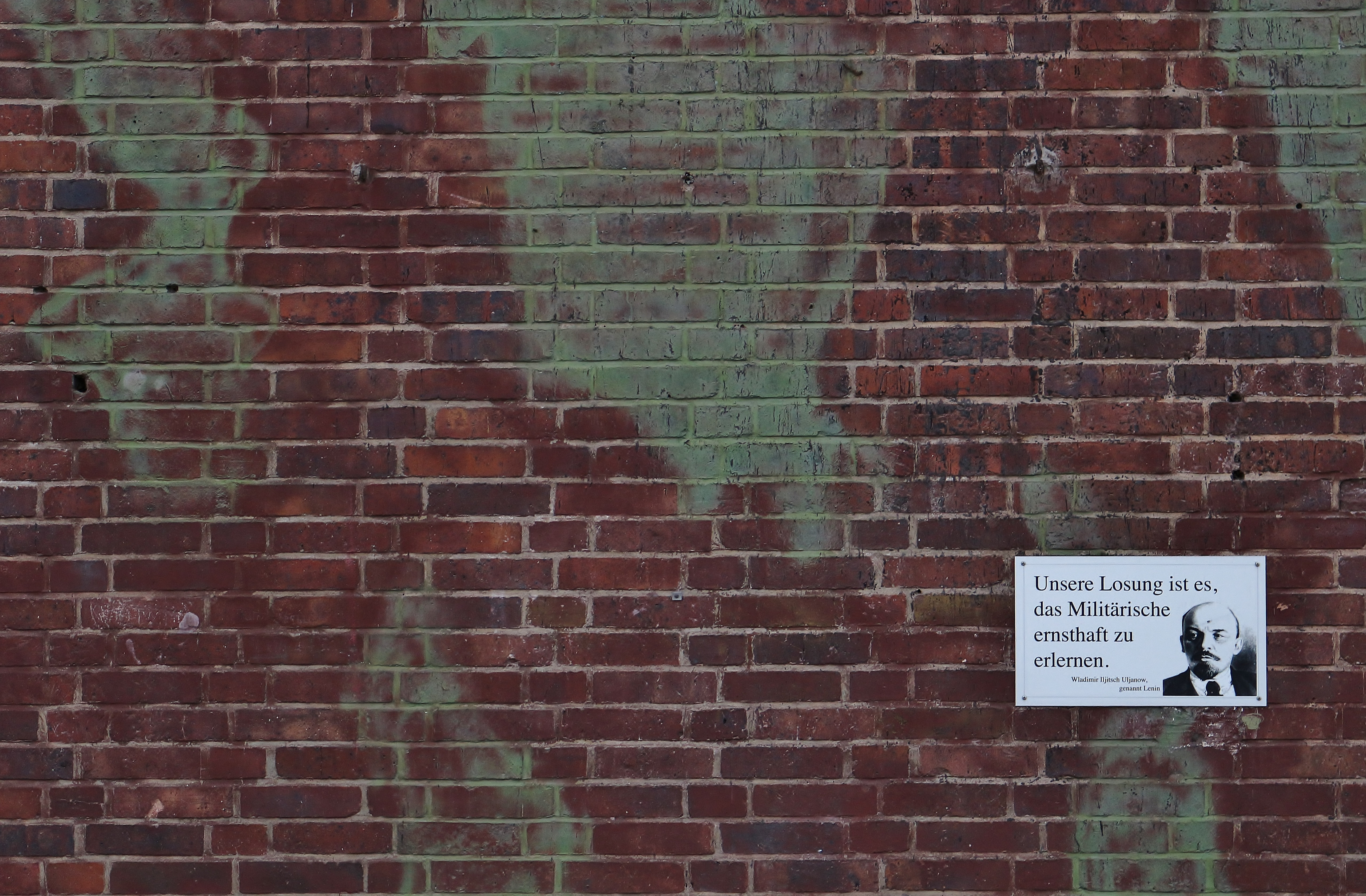 During the GDR, Lenin, Marx and Engels were an omnipresent triumvirate of Socialism, but nowadays it has become really difficult to find them together on German soil. The former airfield in Köthen is one of those few exceptions: At the exterior wall of a big pavilion you can still find their image as simple two-color wall-paintings.