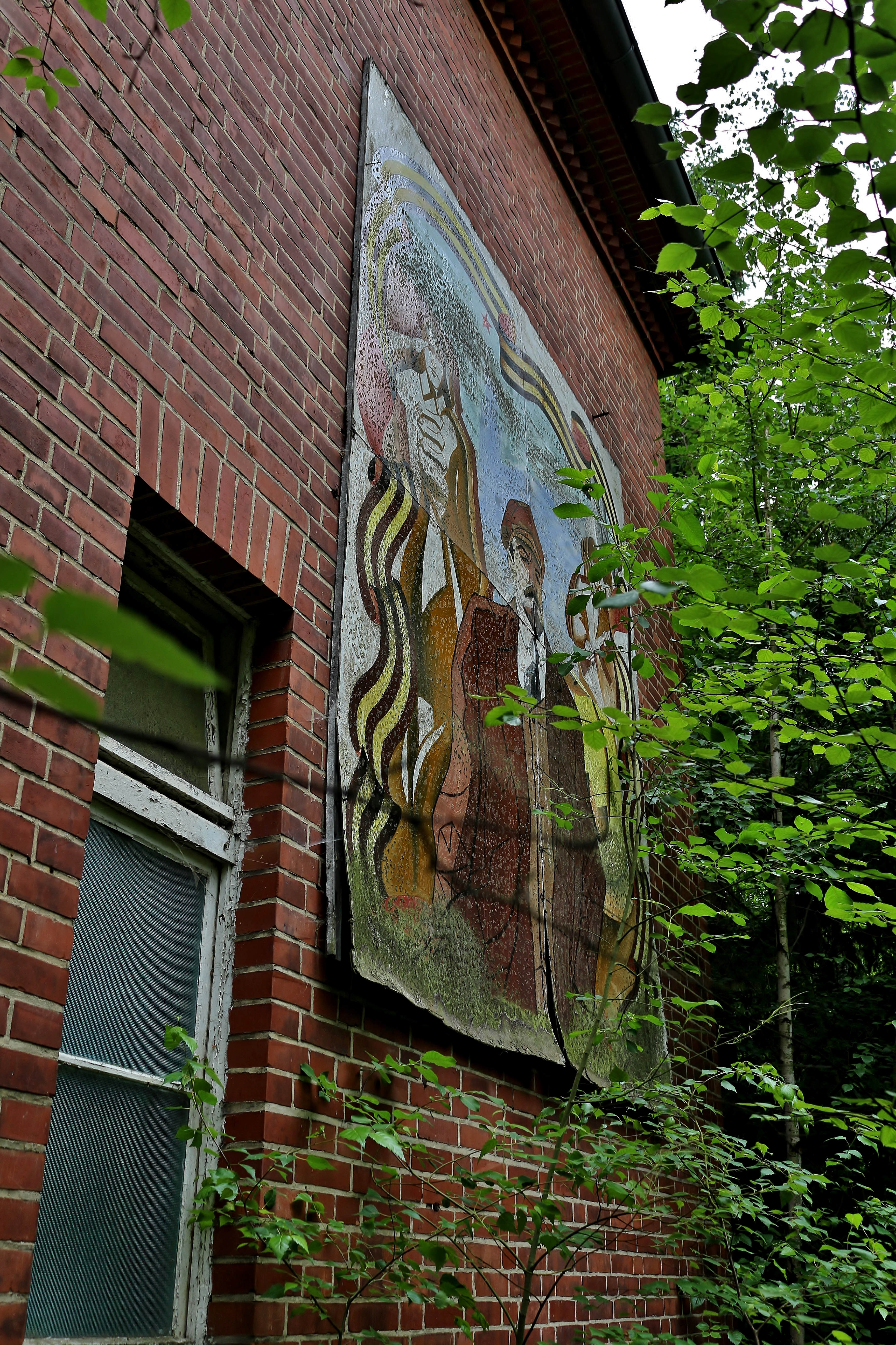 In the middle of this crumbling scenario, it’s surprising to see, how well preserved the panel with Lenin at the façade still is. The 2x 2 meter image shows the hero of the October Revolution with a brown suit and his characteristic working-cap. He looks worried, as if he would want to look personally after each one of the patients, which were admitted here. In the background there are two Soviet soldiers and on the left side, there is also a red star, while on the right side, we can see how a space ship is starting its trip to the infinite cosmos. The picture is framed by a Saint George’s ribbon, a Soviet military symbol for bravery.