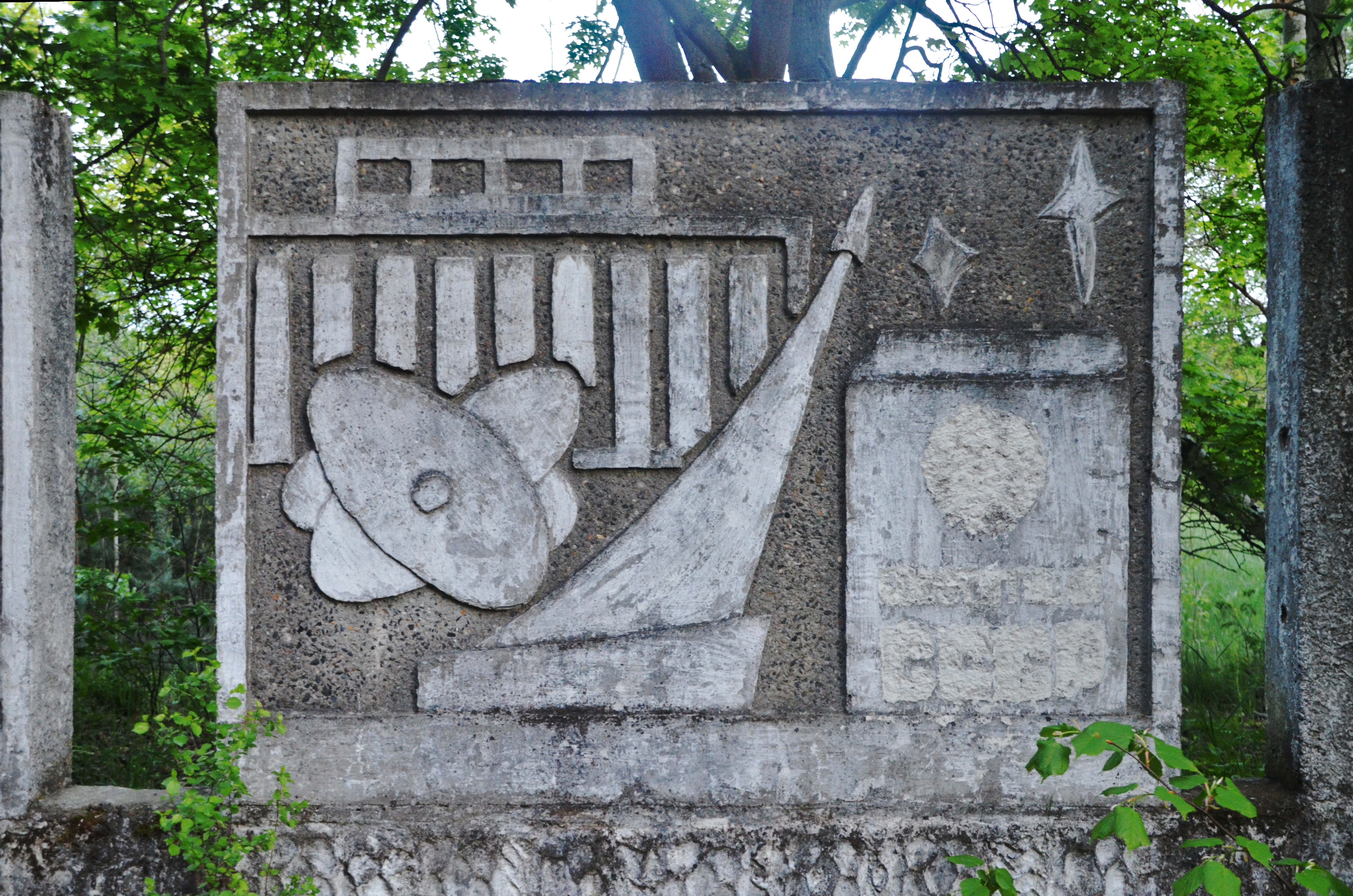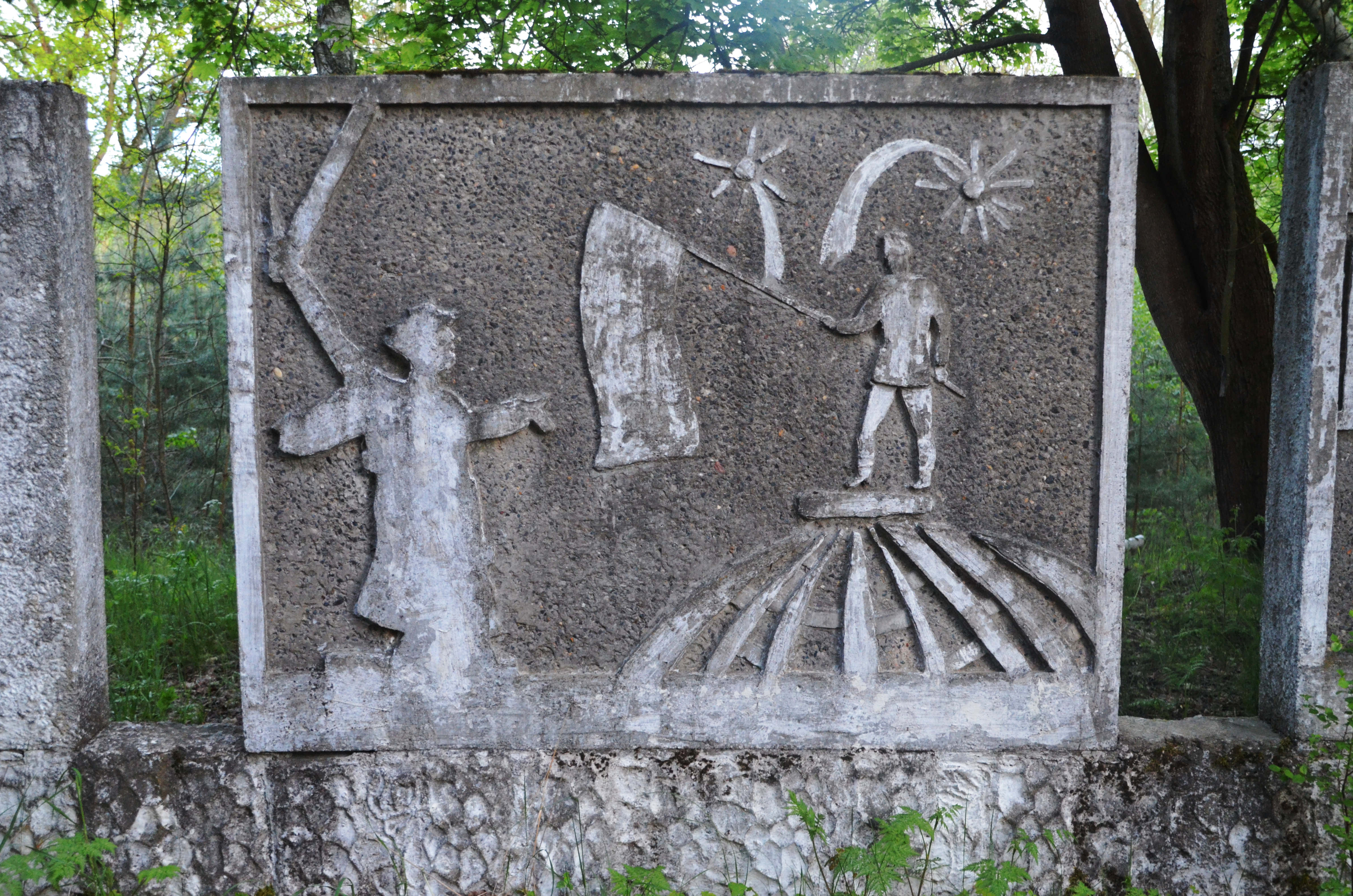 Outside the no-go area, including all the buildings as well as the training camps, which are surrounded by a big wall, there are still some leftovers between wild growing trees and shrubberies. One of those is a relief-ensemble, probably a collective work of the Soviet soldiers. Among the four reflief-walls, there is one dedicated to Lenin. It shows the mythical armored cruiser Aurora, one of the most important military symbols of the Red Revolution, illuminating the head of the revolutionary leader. In the background, the sun rises, announcing the beginning of the new Communist era.