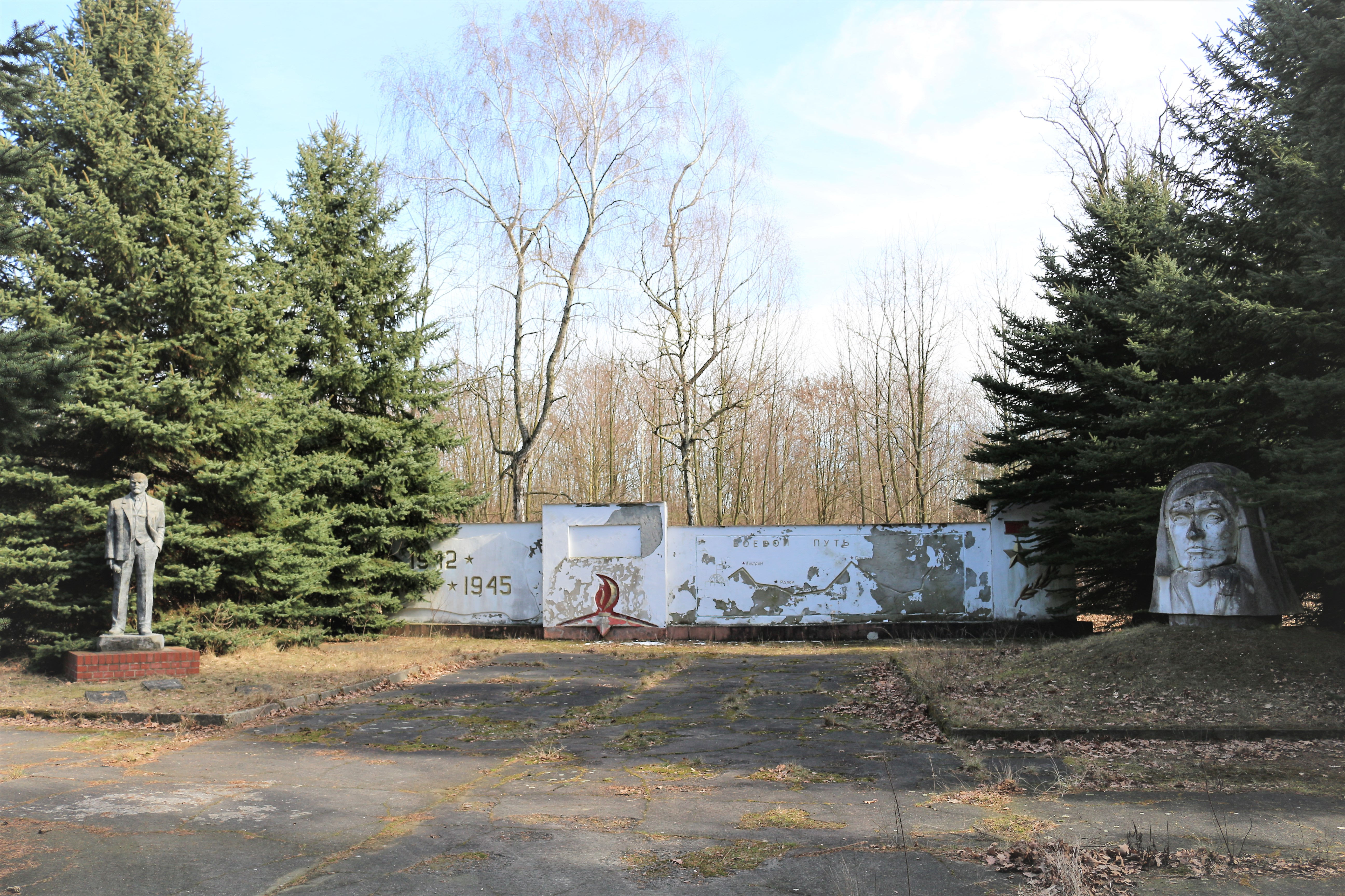 Ein Teil der Anlage wurde inzwischen abgerissen und die Natur erobert rasch diese historische Bühne zurück. Aber man kann auch heutzutage noch Spuren dieser aufgewühlten Vergangenheit finden und so sind in der ehemaligen sowjetischen Garnison noch ein Wandbild mit dem Ruhmespfad der 9. Panzerdivision bis zur Eroberung des Reichtags im Mai 1945, ein Relief von zwei Rotarmisten oder auch eine überlebensgroße Leninstatue zu sehen. Scheinbar wurde die Plastik erst kürzlich renoviert. Sie stellt Lenin in einer außergewöhnlich gelassenen Pose dar: Mit der linken Hand in der Hosentasche und einem sanften Blick in die Ferne strahlt Lenin Ruhe und Entspanntheit aus.