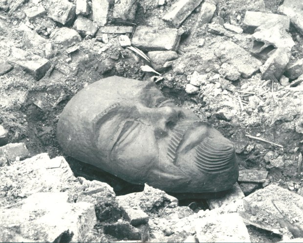 The upper photos show the mask in its actual location the last picture was made when the mask was rescued from a destroyed building in 1945 or 1946.