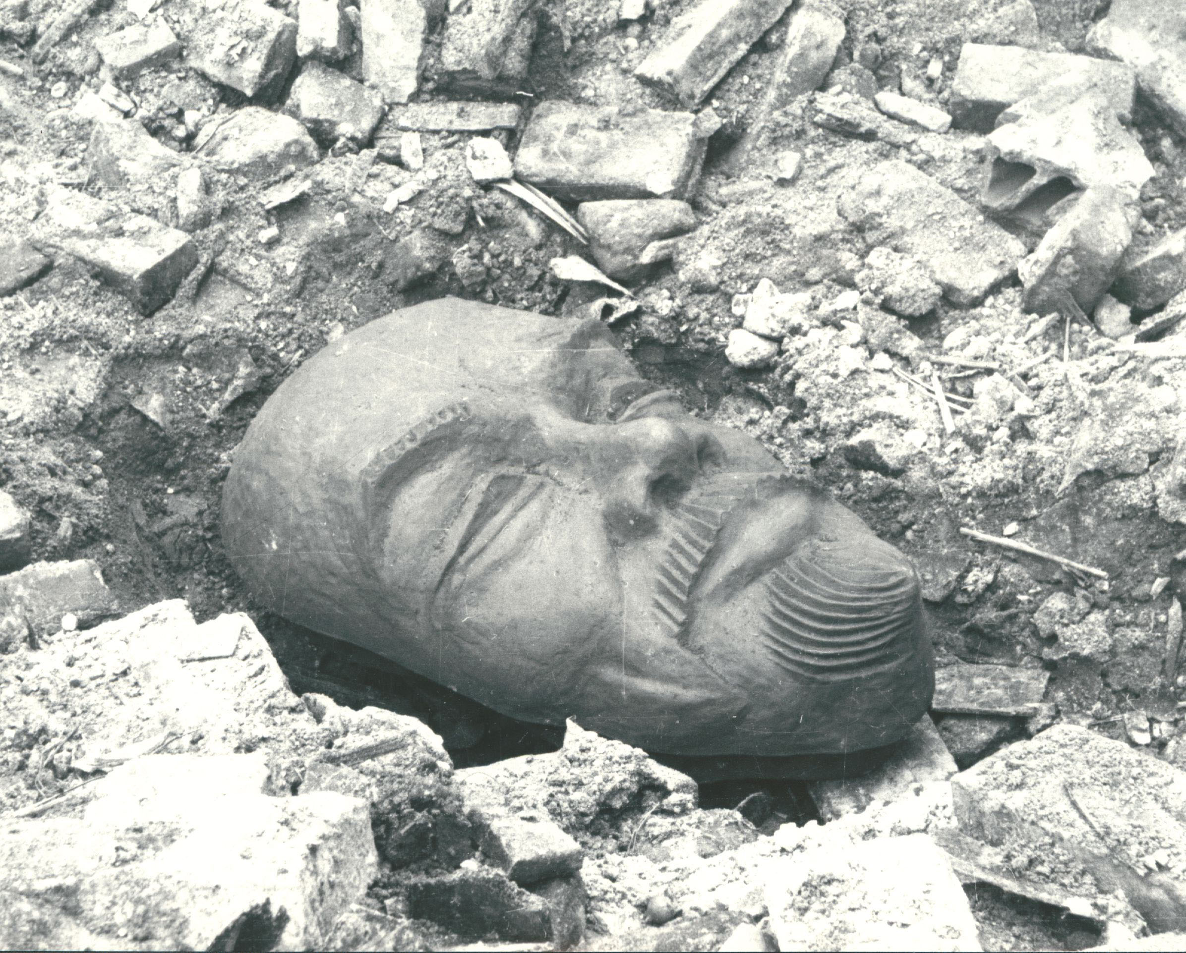 The upper photos show the mask in its actual location the last picture was made when the mask was rescued from a destroyed building in 1945 or 1946.