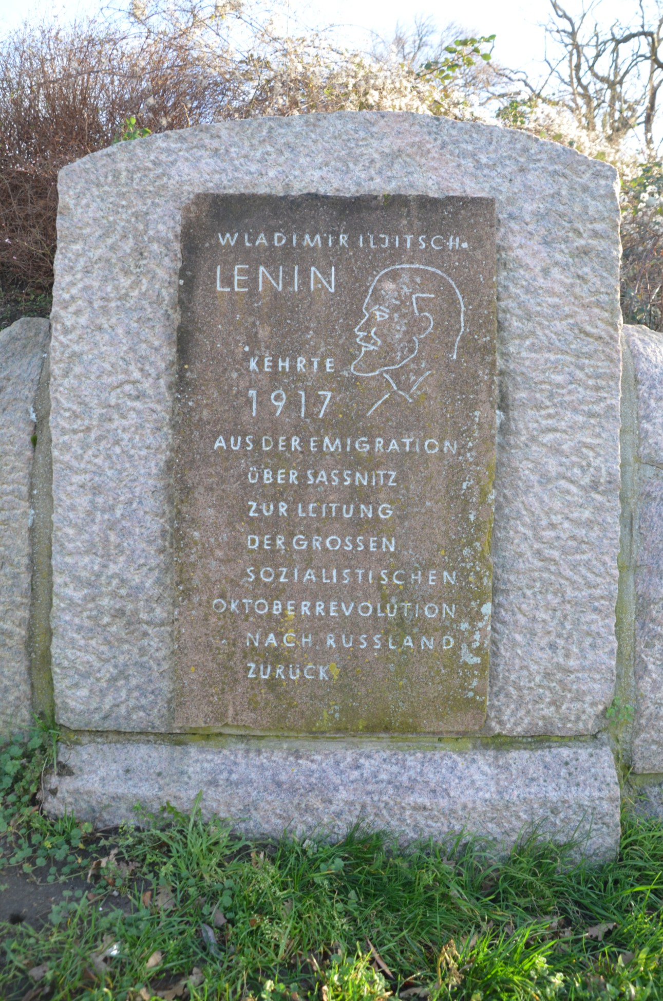 Der Gedenkstein liegt ein bisschen abseits der Fußgängerzone und war viele Jahre lang kaum als Geschichtszeugnis wahrzunehmen, denn die Zeit, der Wind und die Luftfeuchtigkeit hatten aus dem eingravierten Text und dem Kopf Lenins ein fast unentzifferbares Gekritzel gemacht. Doch anlässlich des hundertjährigen Jubiläums der Oktoberrevolution wurde der Stein auf Initiative eines örtlichen Steinmetzen saniert, sodass der Text wieder lesbar geworden ist: „Wlamidir Iljitsch Lenin kehrte 1917 aus der Emigration über Sassnitz zur Leitung der großen sozialistischen Oktoberrevolution nach Russland zurück.” Außerdem wurde auch eine kleine Infotafel angebracht, auf der man die Route von Lenins Reise 1917 sehen kann.