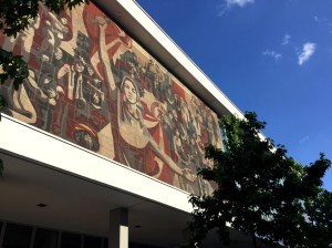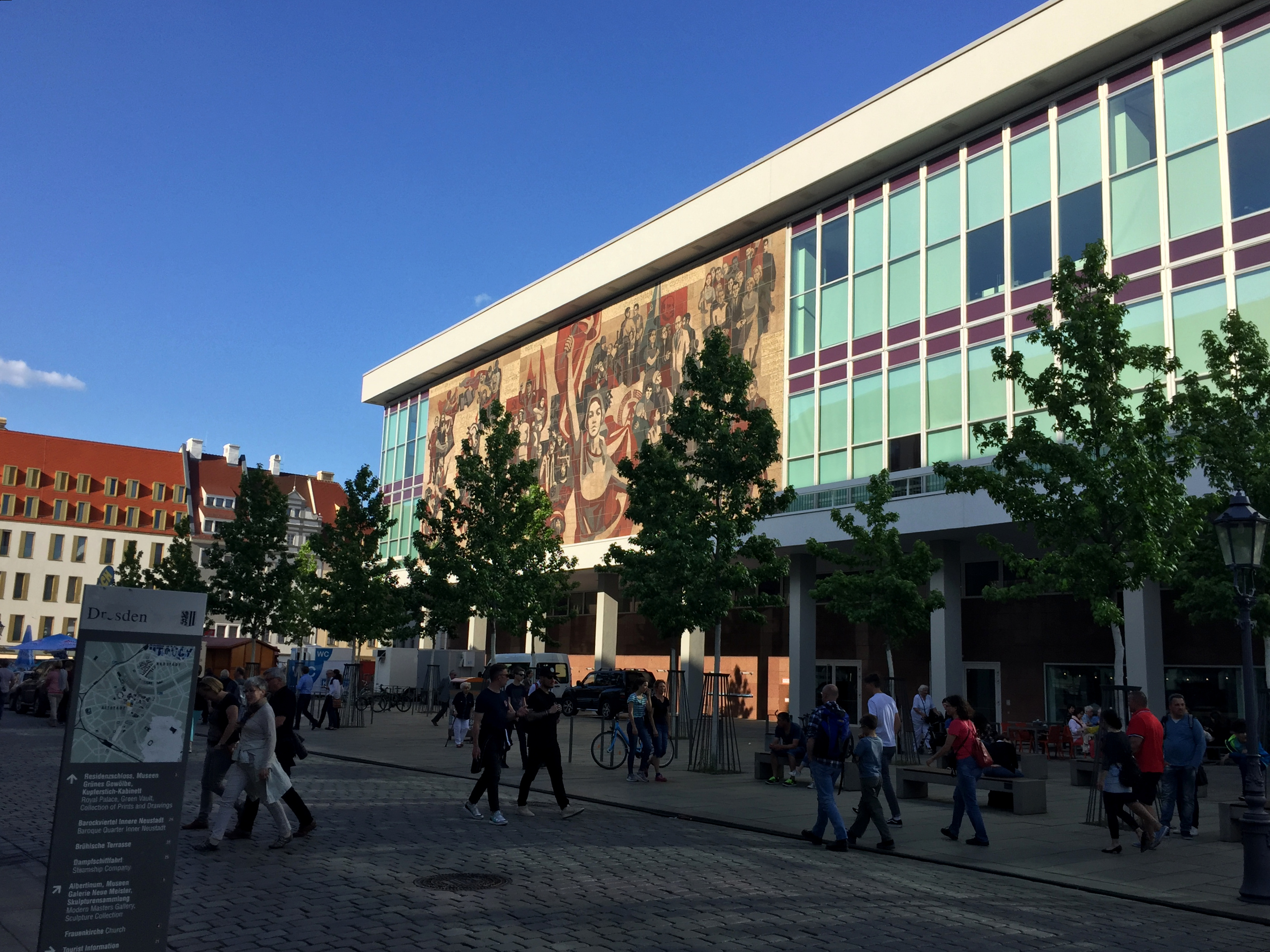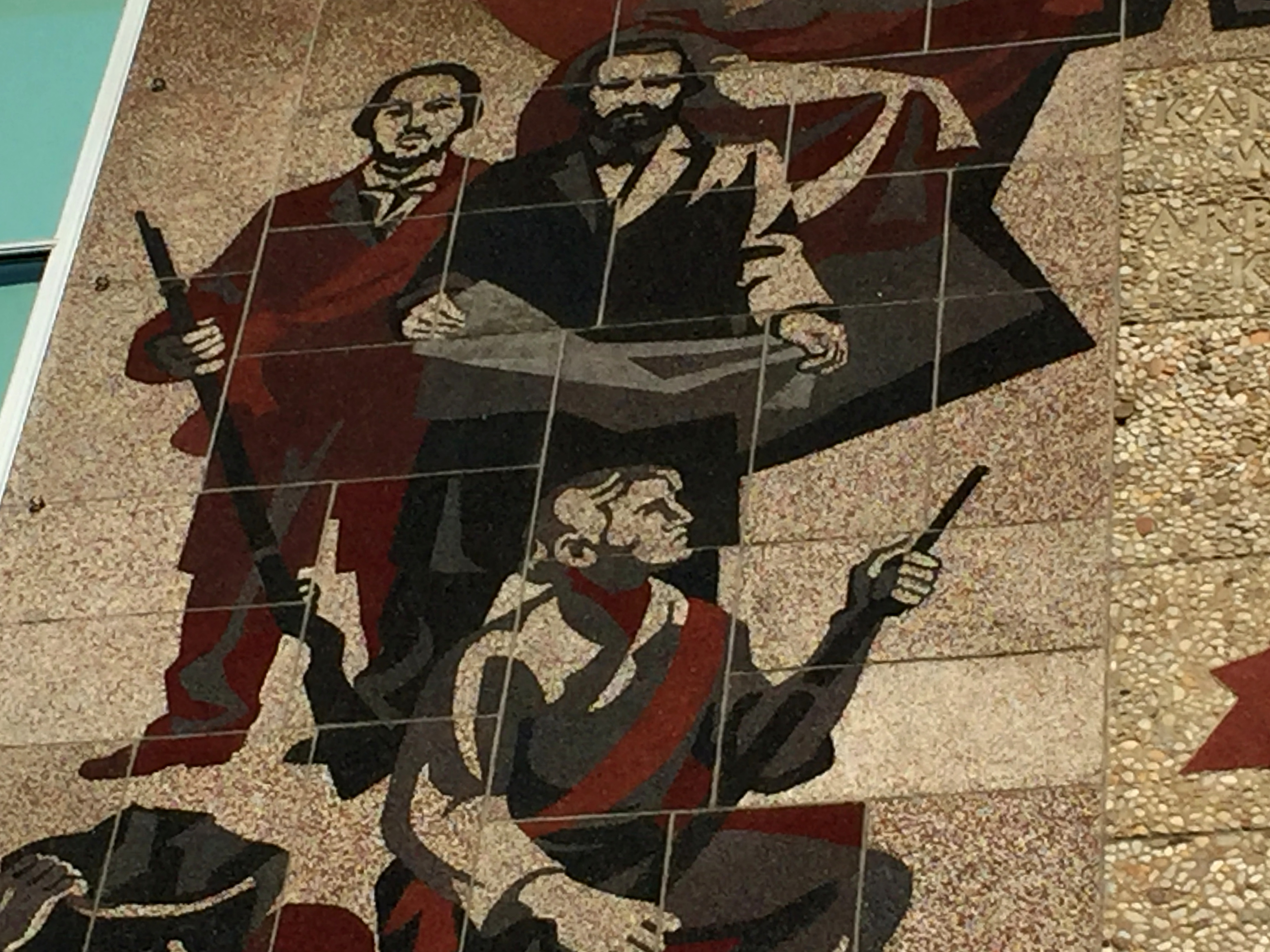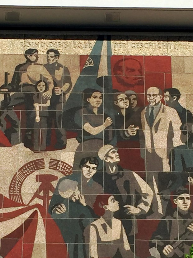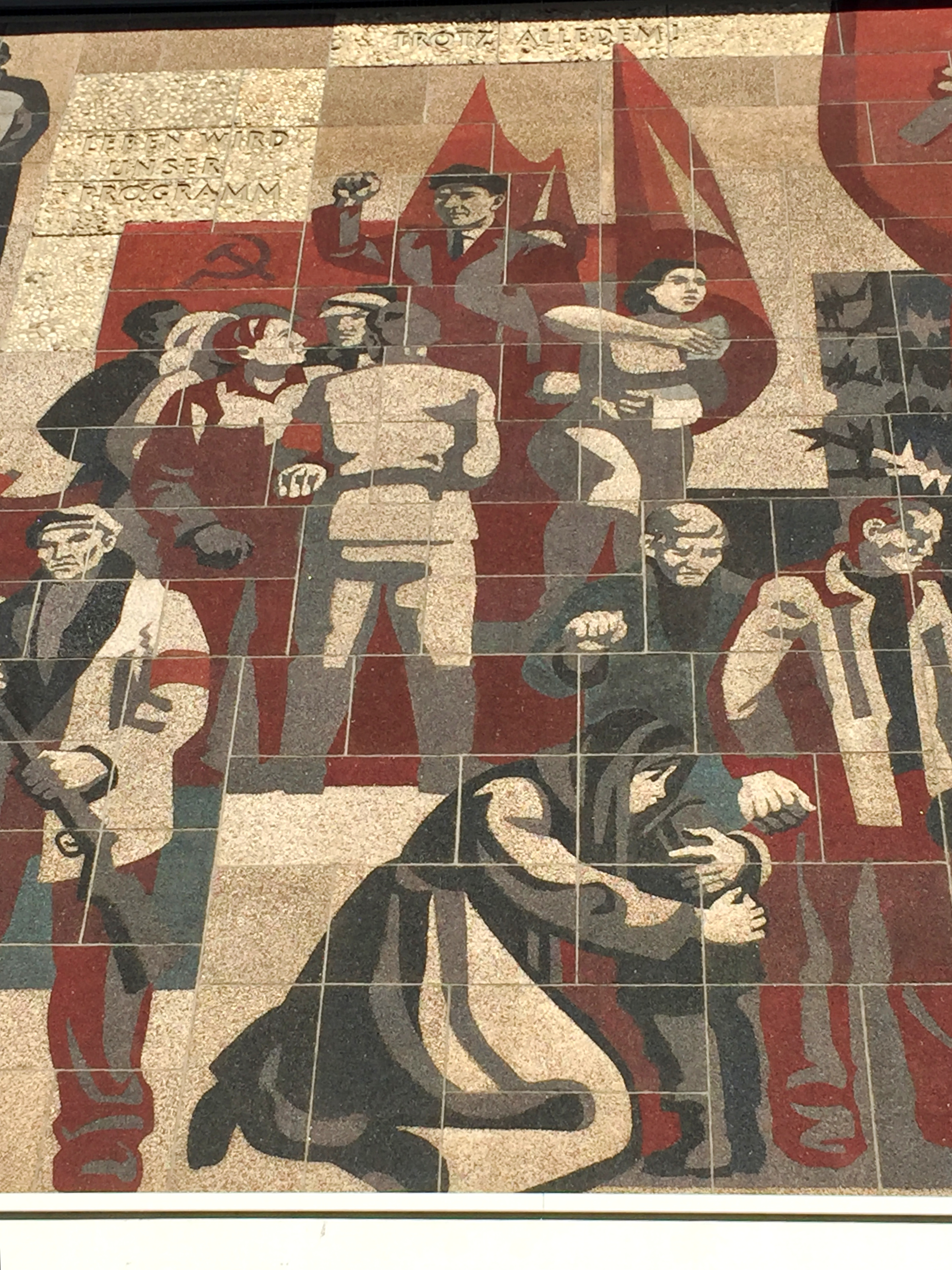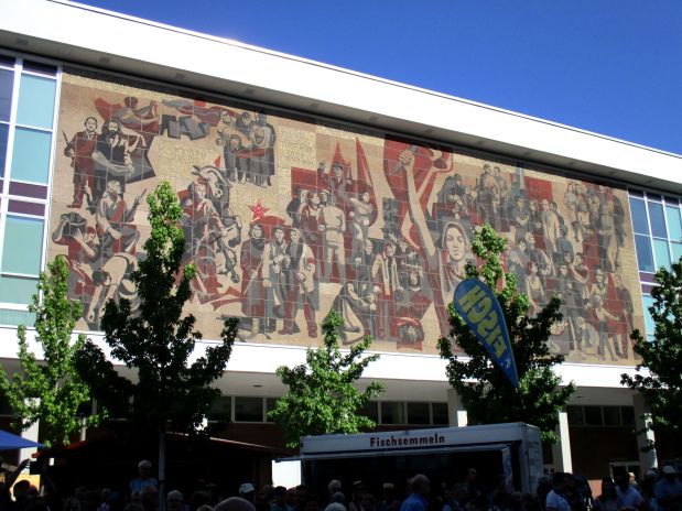 In contrast, the mosaic mural „The Path of the Red Flag“, created by Gerhard Bondzin and a working group of the Dresden Academy of Fine Arts, was only recently completely renovated and is now embellishing an exterior wall of the Palace of Culture. It shows the development of the German workers movement from the bourgeois revolution of 1848/1849 to the GDR period.