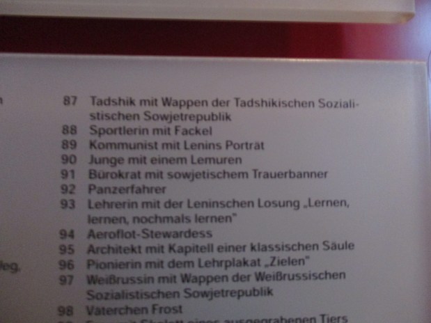 Das Kunstwerk von Bruskin trägt den Titel „Leben über alles“ und thematisiert die Entstehung von ideologischen Mythen. Es präsentiert dabei anhand von 115 aneinandergereihten Einzelbildern viele der wichtigsten kommunistischen Symbole und Ikonen, die in der Sowjetunion weitverbreitet waren. Jedes Bild hat einen eigenen Titel, wobei die Nr. 89 „Kommunist mit Portrait Lenins“ heißt und eine weißliche und statuenhafte Figur zeigt, die ein Oberkörperportrait Lenins in der Hand hält. Lenin trägt einen schwarzen Anzug mit blauer Krawatte. Nur sein roter Kinnbart sticht von den dunklen Tönen hervor und verleiht ihm eine gewisse Feurigkeit, die ihn auch an diesem so sonderbaren Standort leise aufschimmern lässt.