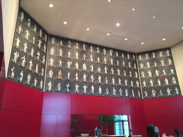 When the Reichstag complex was rebuilt after the German reunification, the intention was to create a new design that would combine art and politics. As a reference to the four-power status of Berlin in the post-war period, artists of the countries of the Allied Armed Forces were invited to the project: The British architect Norman Foster was responsible for the conversion, while contemporary artists from the other three countries contributed with artworks for the interior. From the USA came a stele with digital illuminated text ribbons by Jenny Holzer, from France an installation by Christian Boltanski, and from Russia a triptych by the painter Grisha Bruskin. Bruskin’s work came into the lounge in the Paul-Löbe-Haus, a house directly adjacent to the Reichstag building that accommodates the offices of the members of parliament and the committee meeting rooms of the German Bundestag.