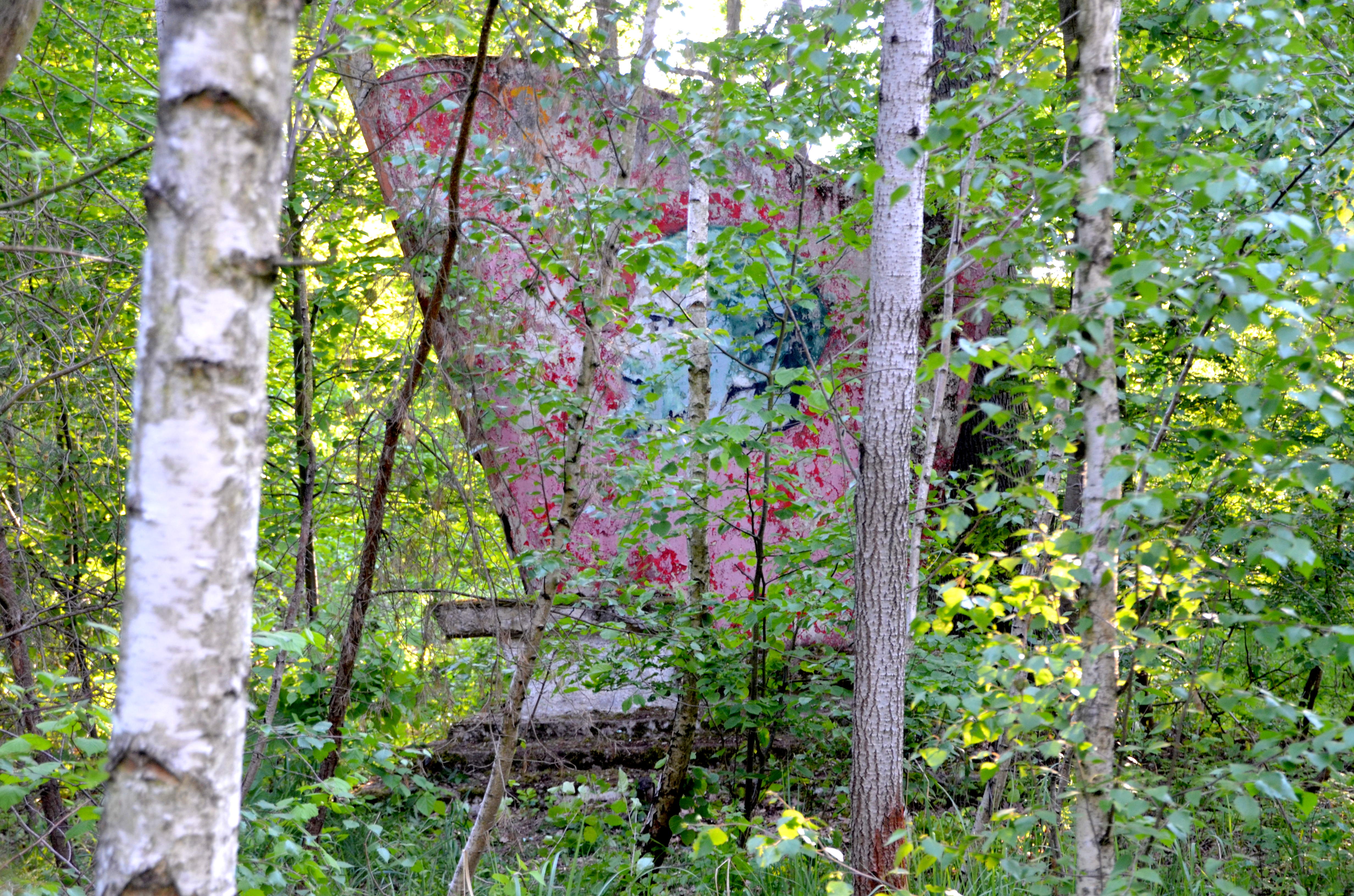 The mural had been in a poor state of repair for a long time: the base was covered with moss, the layers of paint were peeling off and the concrete was crumbling at the sides. Then a graffiti sprayer decided to scribble Lenin with green paint, so that he was hardly recognizable. (By the way, it’s a pity that some idiots actually think they have to prove their courage by spraying on completely abandoned monuments in the forest. Wouldn’t the Brandenburger Tor or the Siegessäule for example be more suitable for a test of courage or coolness.)