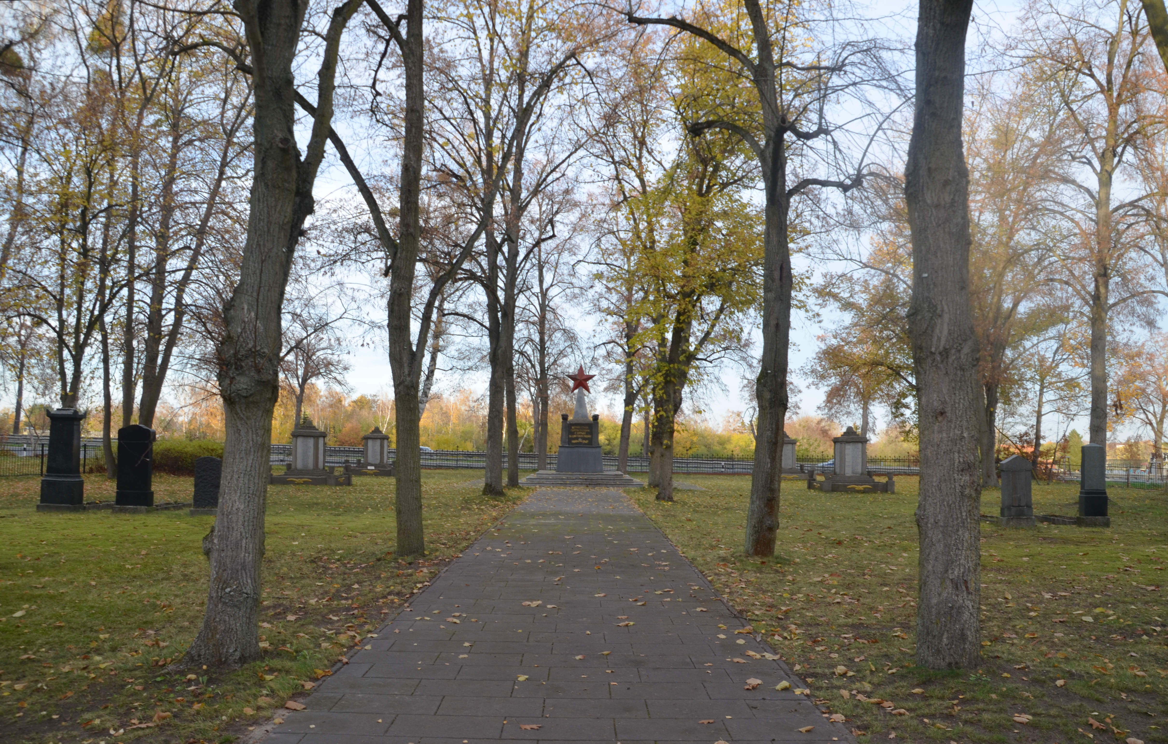 In der Mitte des Friedhofs steht eine Stele, die an der Spitze mit einem roten Stern verziert ist. Das Denkmal hat an zwei Seiten in goldener Schrift einen Text auf russischer Sprache: ewiger Ruhm den im Kampf für das sowjetische Vaterland gefallenen Helden.