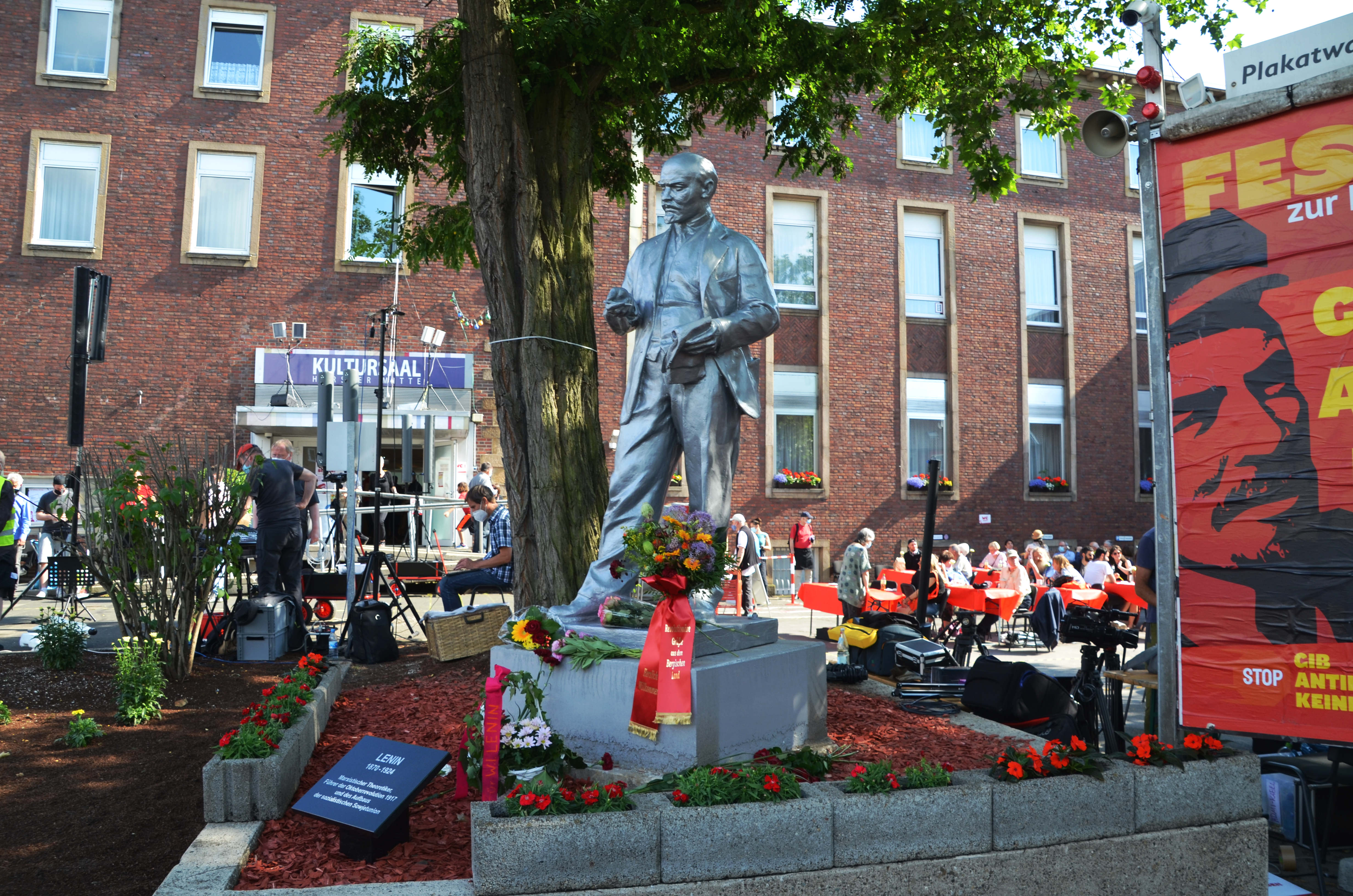 And so it came to the festive inauguration of the pearl-grey painted Lenin statue, the only Lenin monument in West Germany. About 800 people enjoyed a varied program on a sunny Saturday with speeches, music and much more. Also „Lenin is still around“ was there: Carlos Gomes gave a short speech on stage and later signed copies of his book „Lenin lebt“ at the stand of the publishing house Neuer Weg.