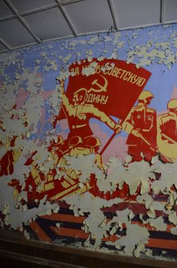 In the offices of a large hall, where in former times probably aircraft parts were produced or repaired, you can also still see the mural with an oversized head of Lenin. Behind him a flag is waving with the slogan: „All power to the Soviets!“ On the lower side there is an orange and black St. George’s ribbon, a symbol of military bravery, while in the right background the Kremlin tower rises. In the centre is a Red Army soldier with a red flag bearing the hammer and sickle and an inscription in Russian: „For our Soviet Homeland!“
