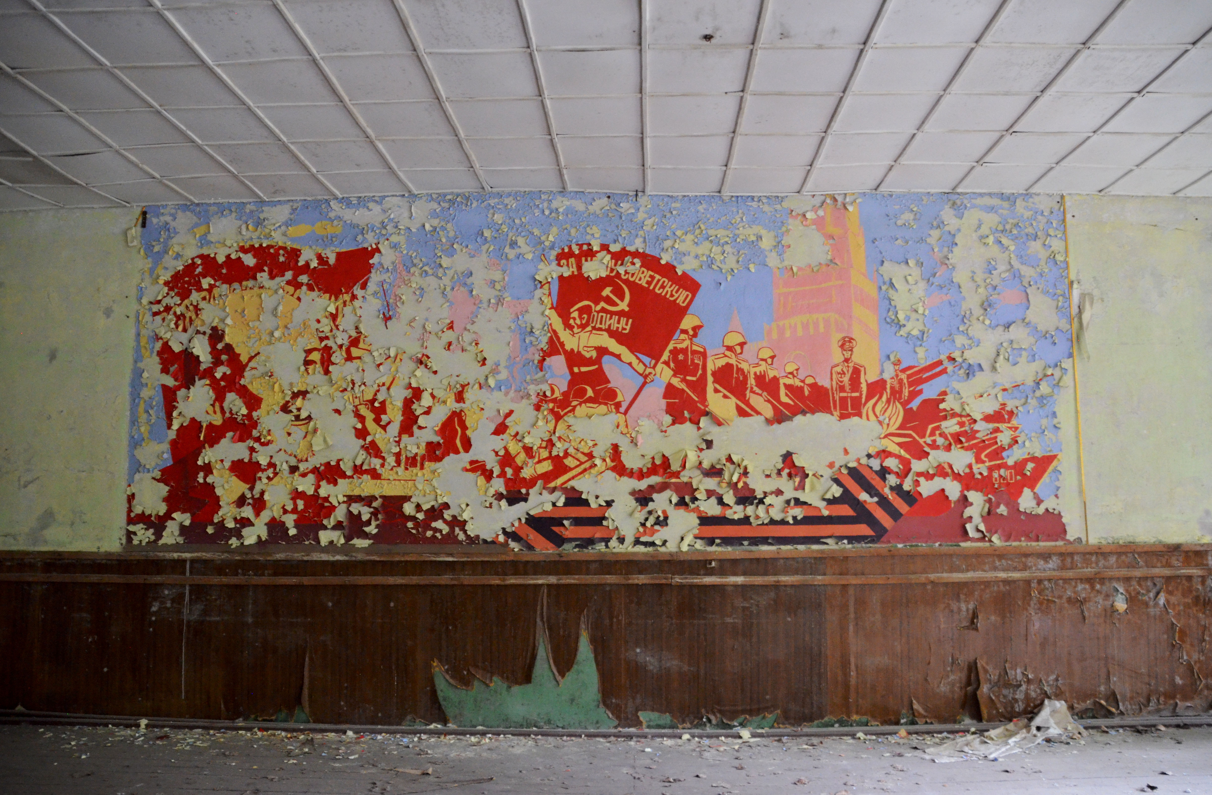 In den Büroräumen einer großen Halle, in der früher vermutlich Flugzeugteile produziert oder repariert wurden, kann man auch noch das Wandbild mit einem überdimensionalen Leninkopf sehen. Hinter ihm weht eine Fahne mit der Losung: „Alle Macht den Sowjets!“ Auf der unteren Seite ist ein orange-schwarzes Sankt-Georgs-Band abgebildet, ein Symbol militärischer Tapferkeit, während rechts im Hintergrund der Kreml-Turm emporragt. Im Zentrum steht ein Rotarmist mit einer roten Fahne, auf der Hammer und Sichel sowie eine Inschrift auf Russisch zu erkennen sind: „Für unsere sowjetische Heimat!“