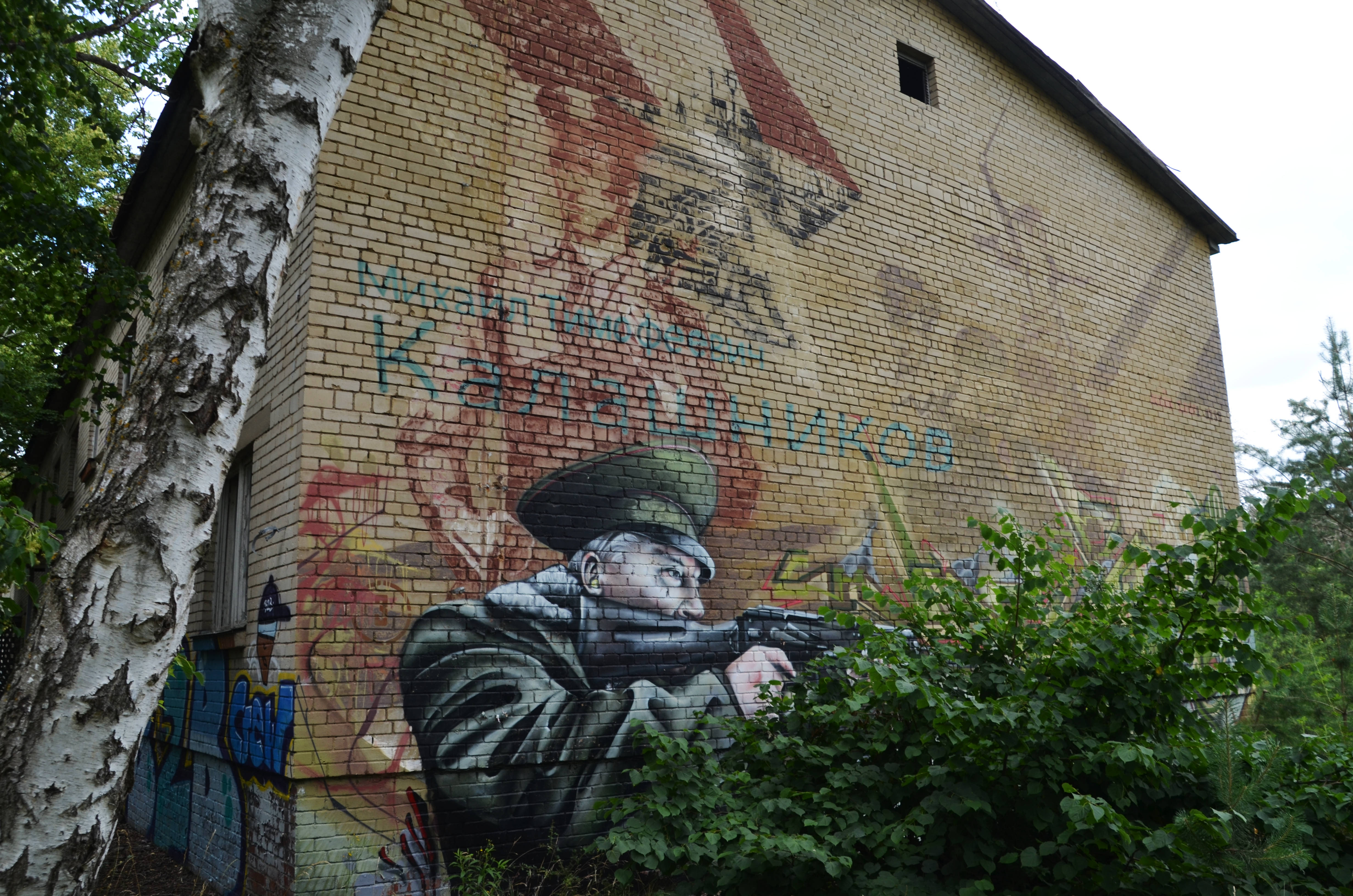In this former base of the Group of Soviet Forces in Germany, which has been lying fallow for 30 years, large-format murals have been preserved on three façades of two-storey buildings. Some elements are very faded and hardly recognizable. Lenin, however, shines in its old freshness after the six-meter-high mural was freshened up true to the original by a „street artist“. To Lenin’s right, the artist sprayed a Soviet flag in graffiti style, thus creating a new, intertemporal collage work. The two murals on the adjacent buildings were also supplemented by works of „Street Art“.