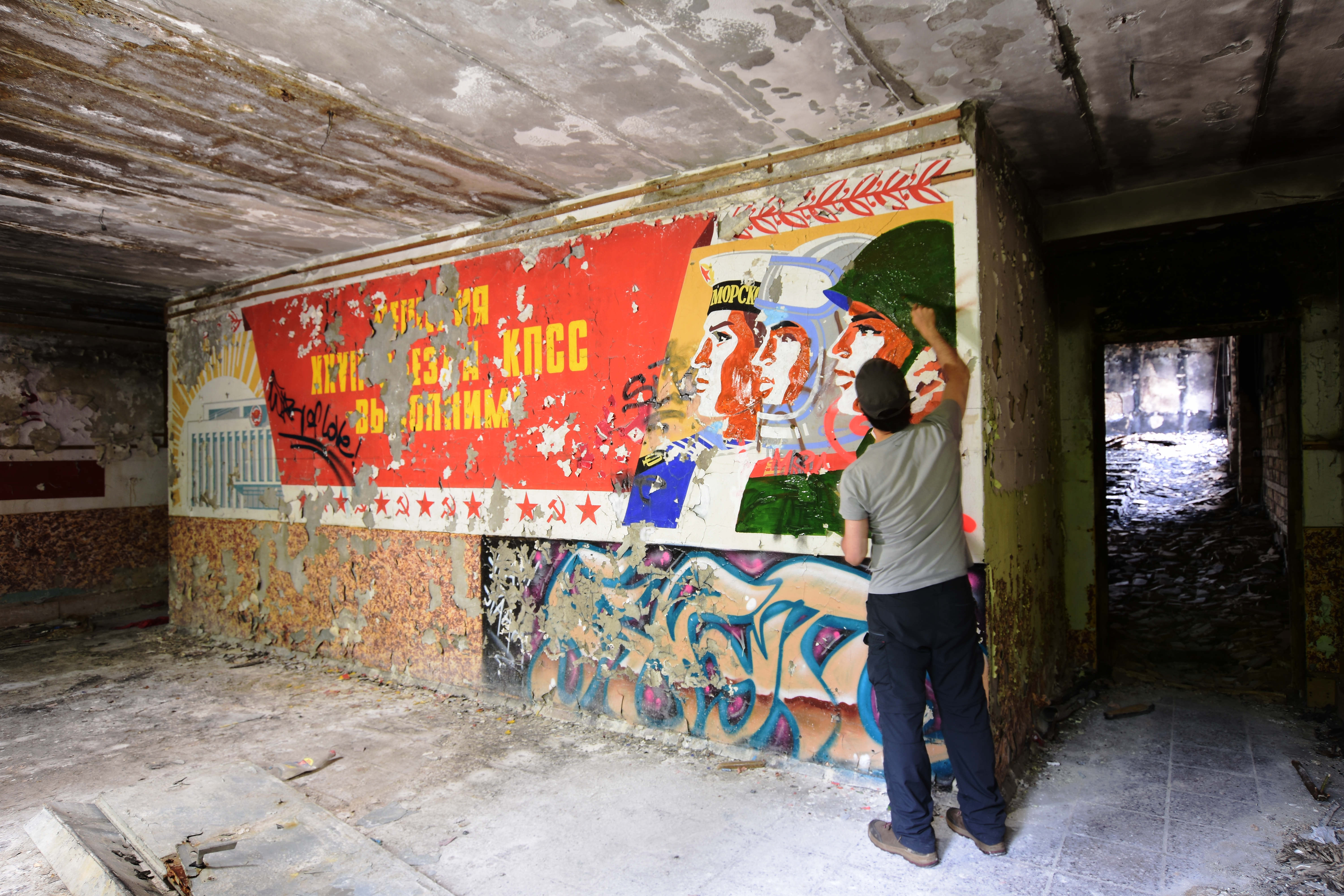ENGLISH: Inspired by the restorative action, „Lenin is still around“ also got down to work together with Thomas (akaphotosucher) and tried to restore a stained wall poster of the GSSD in the former cultural centre. It was not an easy job due to lack of time and experience, but the final result can be considered satisfactory: The Red Army soldiers of the Navy, Air Force and Land Forces were freed from scribbling and can again look proudly at the central slogan: „We will fulfil the resolutions of the 27th Congress of the CPSU!“.
