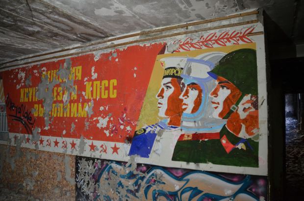 Von der restaurativen Aktion inspiriert, machte sich auch „Lenin is still around“ zusammen mit Thomas (aka photosucher) an die Arbeit und versuchte ein verunreinigtes Wandplakat der GSSD im ehemaligen Kulturhaus zu restaurieren. Es war aufgrund mangelnder Zeit und Erfahrung keine leichte Arbeit, aber das Endergebnis kann als zufriedenstellend betrachtet werden: Die Rotarmisten der Marine, der Luftwaffe und des Heeres wurden erst einmal von der Kritzelei befreit und können wieder stolz zur zentralen Losung blicken: „Wir werden die Beschlüsse des 27. Kongresses der KPdSU erfüllen!“