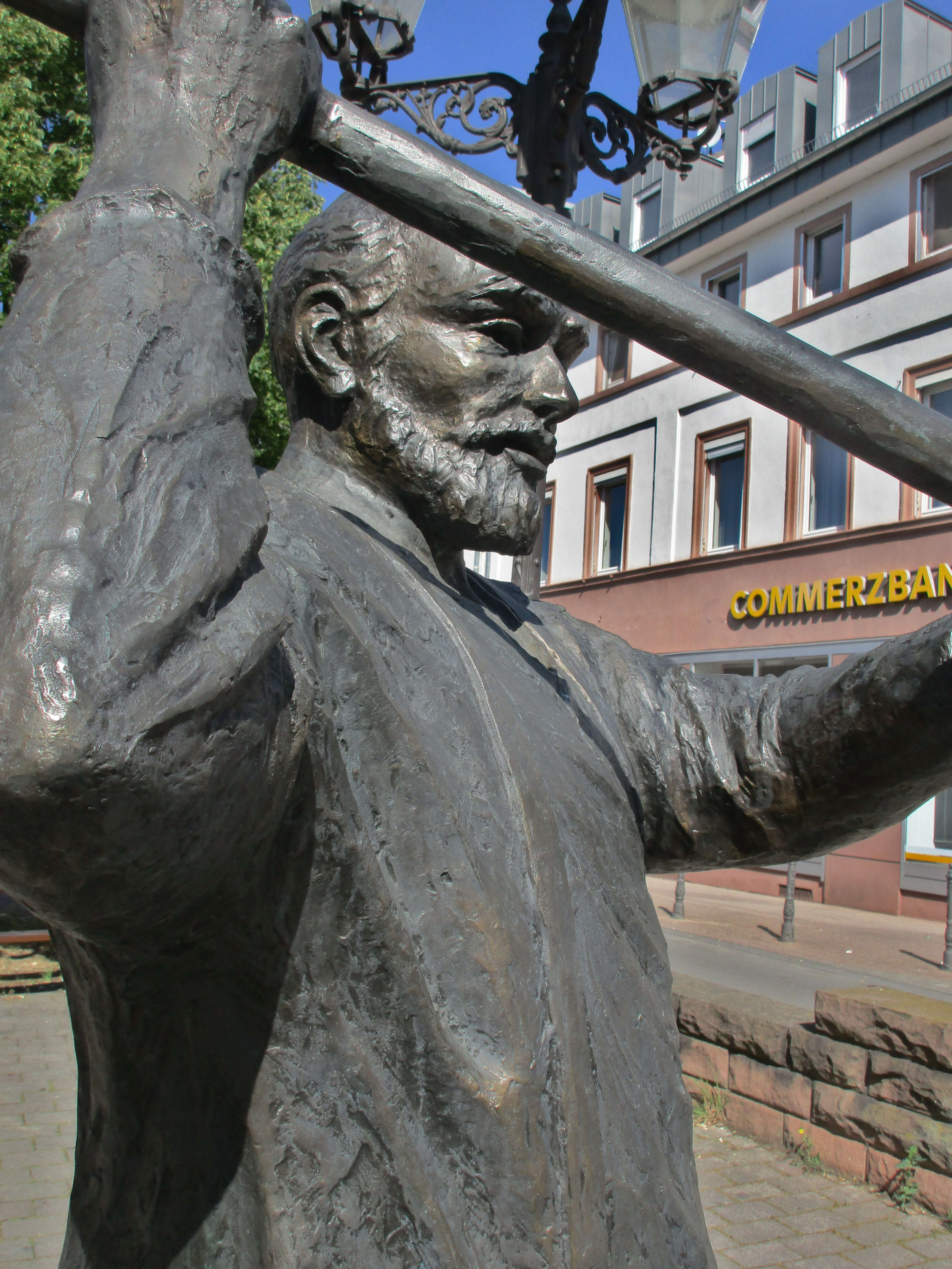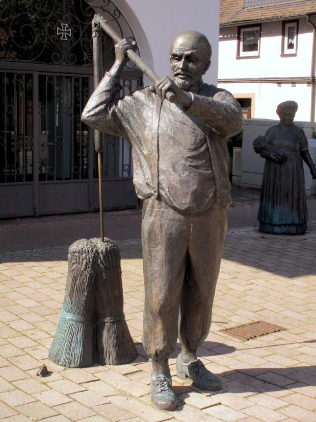 How this Lenin, disguised as a peasant, came to the corner of Frankfurter Str./Mainzer Str. is an extraordinary story: The city of Groß-Gerau wanted to commemorate its peasant past and erect a monument with a representation of everyday farm labour. Derra designed the constellation with the three threshers as central figures. When the bronze work of art was cast in Poland, it happened: Probably to save costs, the foundry remoulded an old Lenin bust at one of the peasants. Although he was given a small beard, a slightly higher forehead and a larger belly, it remained unmistakable: Lenin, the founder of the world’s first peasant and workers‘ state, the USSR, as a dedicated agricultural worker – what a historical irony!
