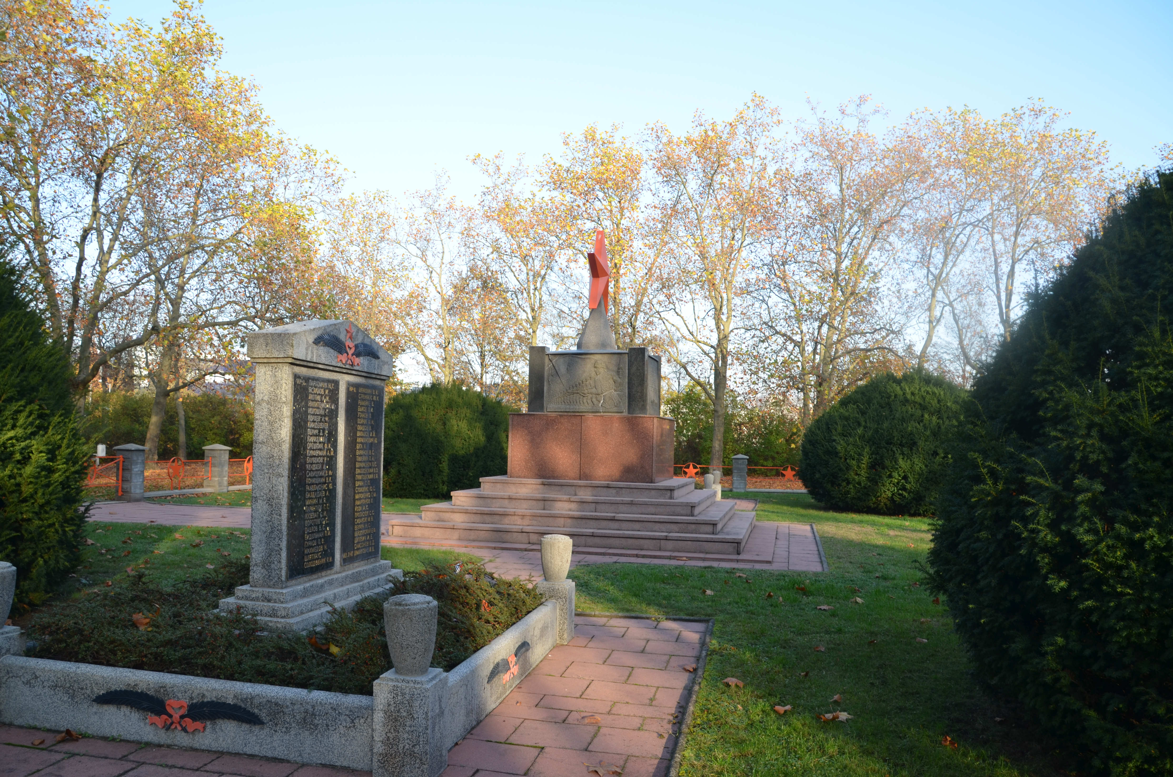 Im Rathenaupark, am südlichen Ende von Hennigsdorf, befindet sich ein sowjetischer Kriegsfriedhof, der nicht zu übersehen ist. Die roten Sterne, vor allem der große Stern auf dem zentralen Denkmal, stechen aus den umgebenden Grün- und Brauntönen hervor.