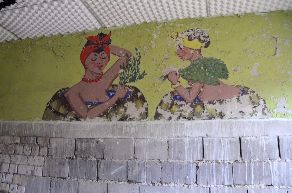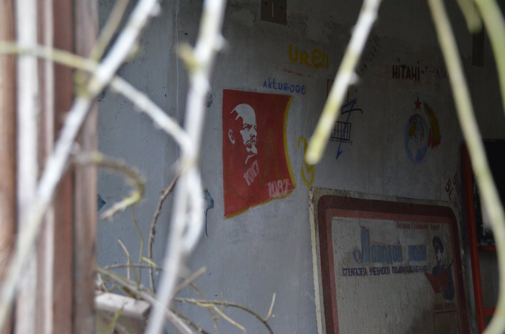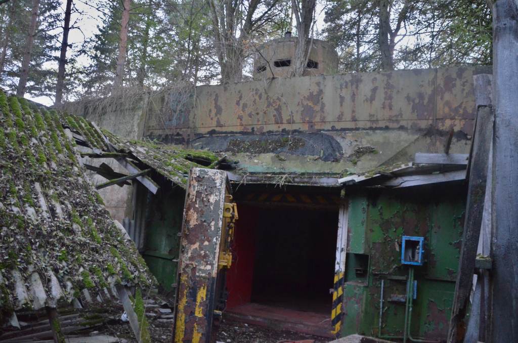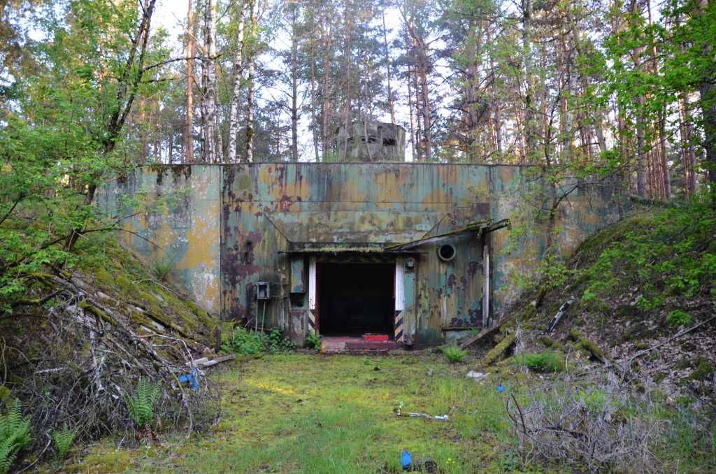 The construction of the complex took place from May 1967 to December 1968. Camouflaged in the forest, two identical bunkers were built in which a total of 200 nuclear warheads could be stored, along with separate living, training and technical areas. This secret site was completely abandoned in 1990 and part of it has since been demolished. However, the two nuclear bunkers are still standing as well as some buildings and facilities such as an outdoor swimming pool, a sauna and a shooting stand, all located in the south-eastern area. Here, in a weathered cottage, you can also find the white side portrait of Lenin on a red background with the dates 1917 and 1987. On the wall you can still see a Soviet emblem and some inscriptions presumably made by children. This could have been a former school, especially as there is also a blackboard and toys in the room.