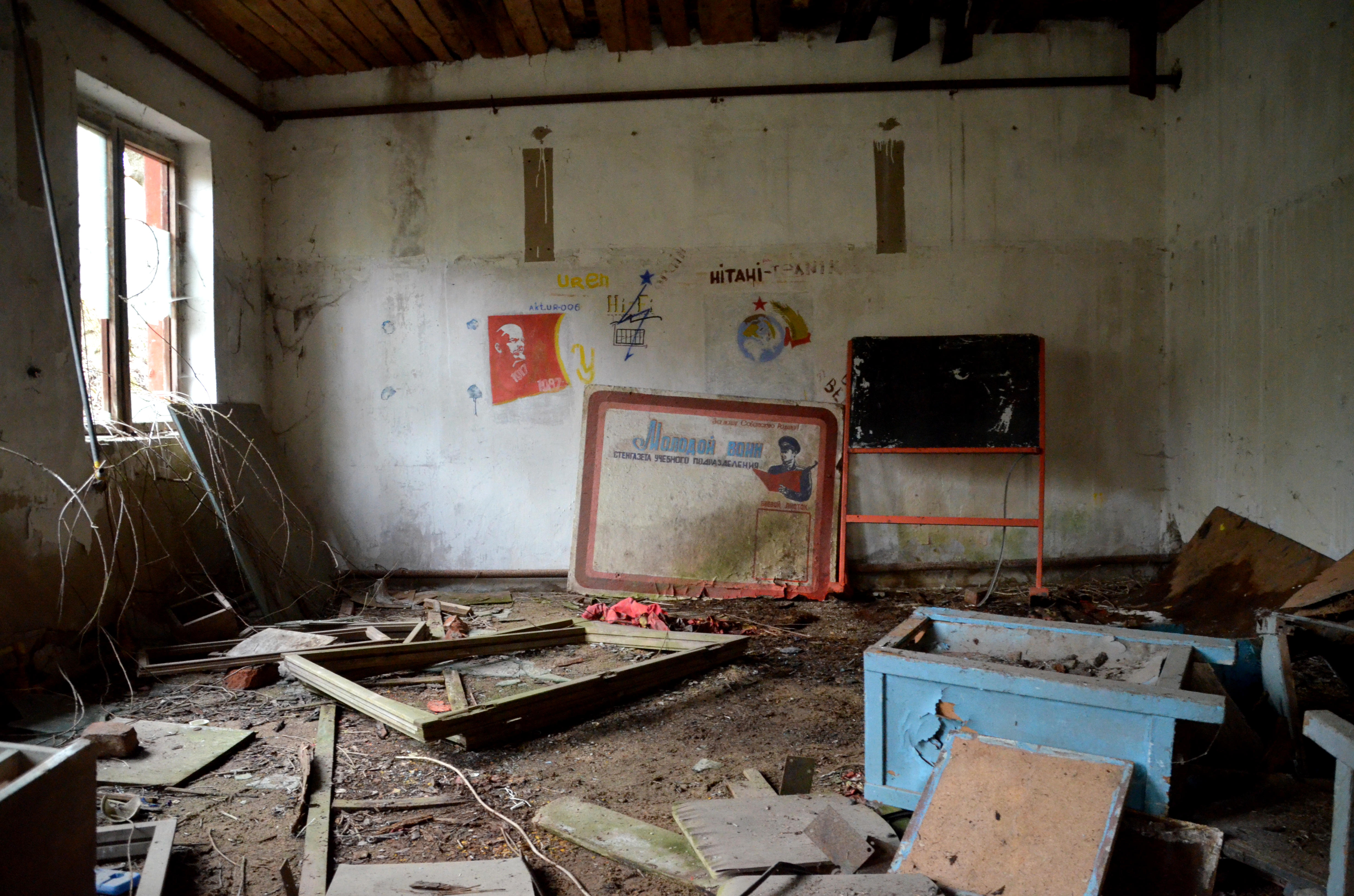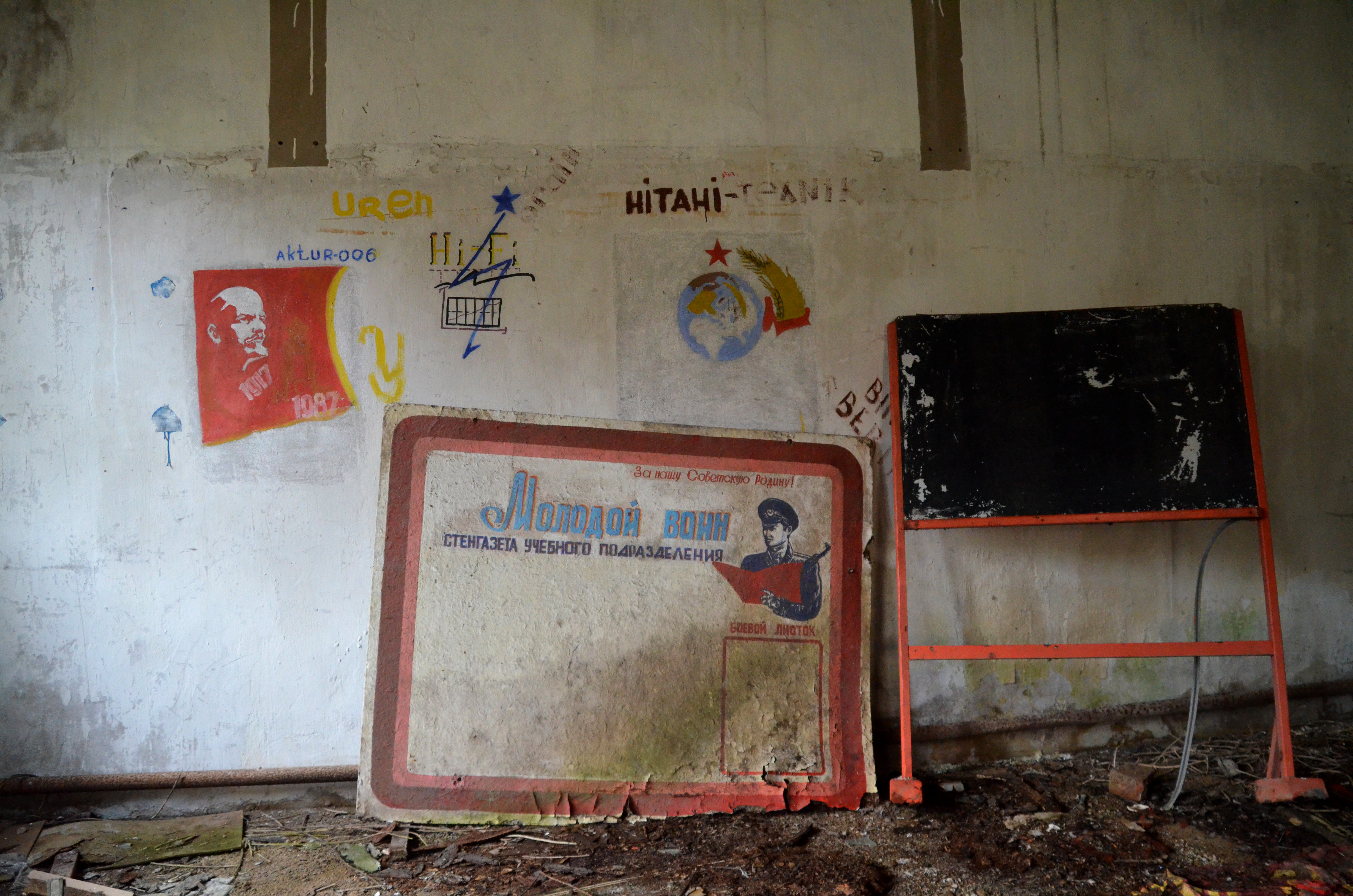 The construction of the complex took place from May 1967 to December 1968. Camouflaged in the forest, two identical bunkers were built in which a total of 200 nuclear warheads could be stored, along with separate living, training and technical areas. This secret site was completely abandoned in 1990 and part of it has since been demolished. However, the two nuclear bunkers are still standing as well as some buildings and facilities such as an outdoor swimming pool, a sauna and a shooting stand, all located in the south-eastern area. Here, in a weathered cottage, you can also find the white side portrait of Lenin on a red background with the dates 1917 and 1987. On the wall you can still see a Soviet emblem and some inscriptions presumably made by children. This could have been a former school, especially as there is also a blackboard and toys in the room.
