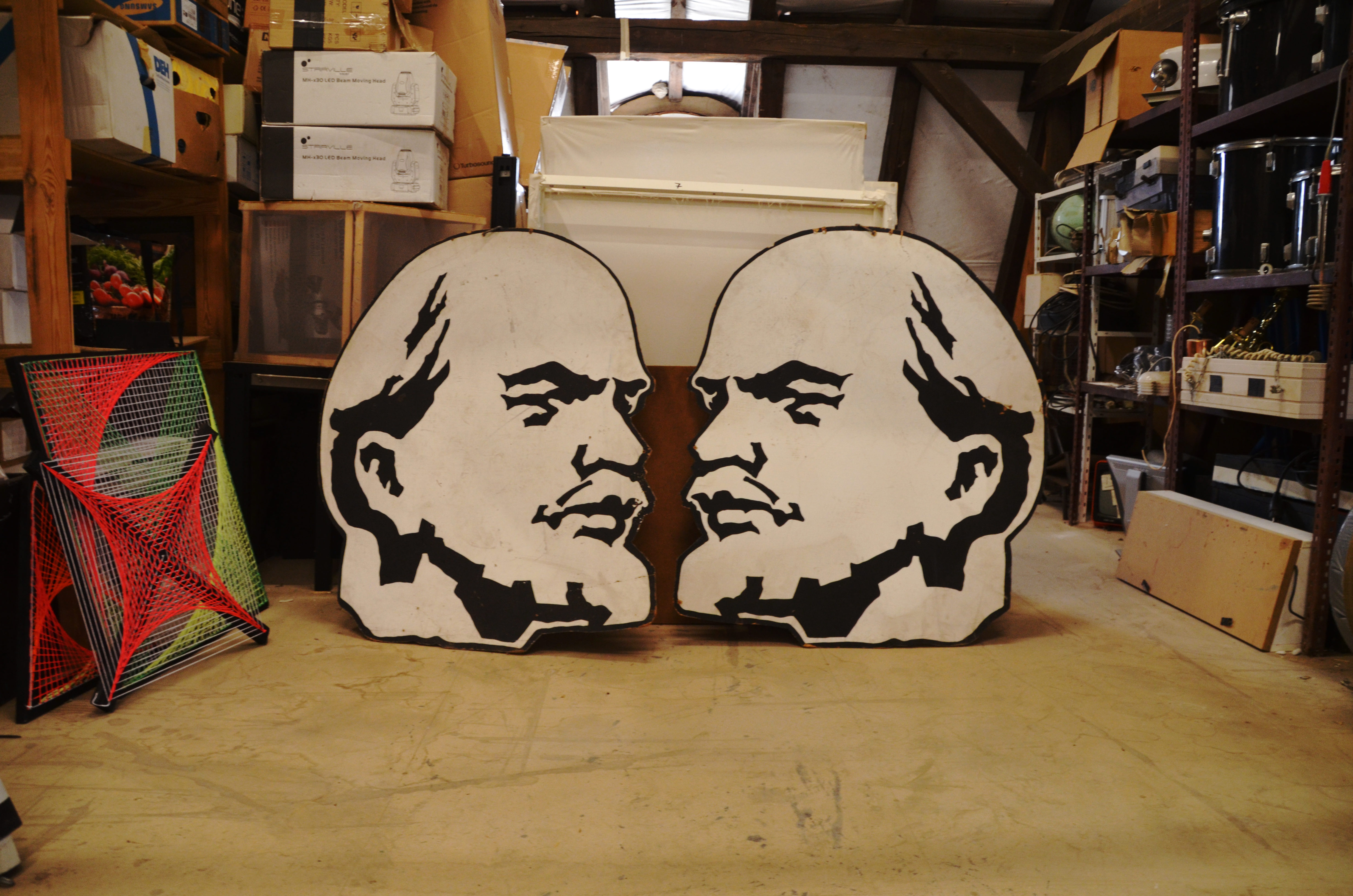 A glass painting over two meters high with the revolutionary leader as the central figure is particularly interesting from an art-historical point of view. It’s an original leftover from the Soviet barracks and shows a side portrait of Lenin in the middle of a red star, surrounded by infrastructure buildings, a space rocket, two youths and a group of pioneers. This constellation symbolizes the modern development of the Soviet Union and the optimistic perspectives for the future. This unique piece hung on a wall in the local technical university for a long time. In 2019, the administration of the university wanted to get rid of it and gave it to the association, where it is currently stored. Soon it will be placed in the office area.