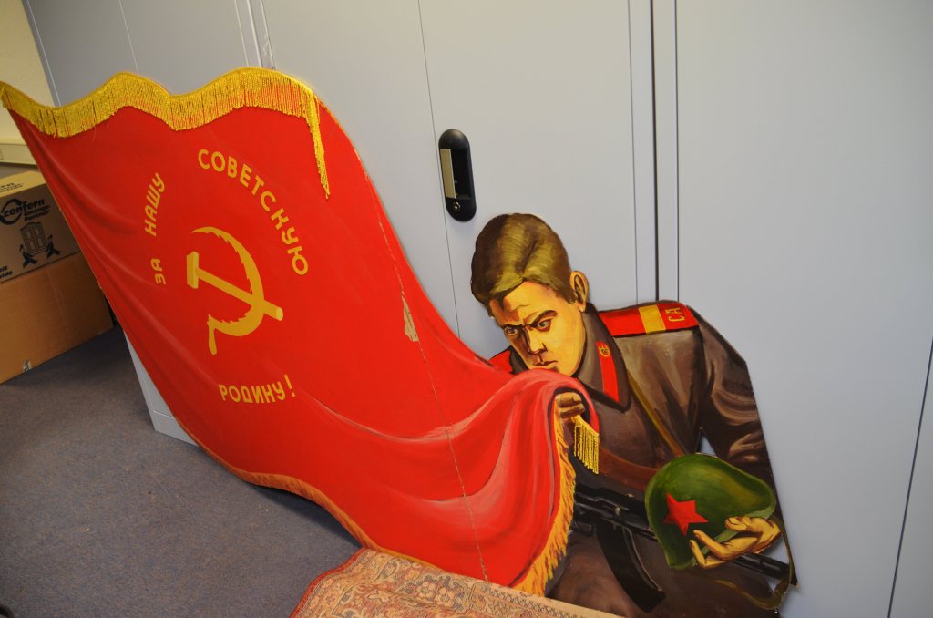 During a visit to some of the storage spaces, we had the opportunity to document many of the items. Of particular interest to us were the two most important representations of Lenin: a wooden relief shows a Red Army soldier in front of a banner with Lenin. Under the banner there is the inscription „Work for peace“. A red carpet, in turn, features a side portrait of Lenin and his birth and death dates. However, the most important Lenin figure in the Schwerin barracks disappeared immediately after the reunification: When the Soviet barracks were dismantled, the statue of Lenin standing at the entrance was accidentally destroyed and then disposed of. It is one of many examples of the disrespectful treatment to the cultural heritage of the Soviet Army in East Germany.